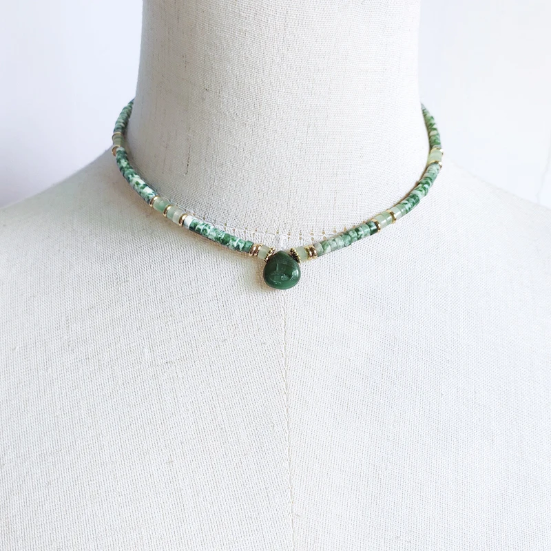 Boho Colorful Natural Stone Beaded Necklace New Winter 2022 Creative Design Dot Green Jade Flat Disc Round Stone Collar