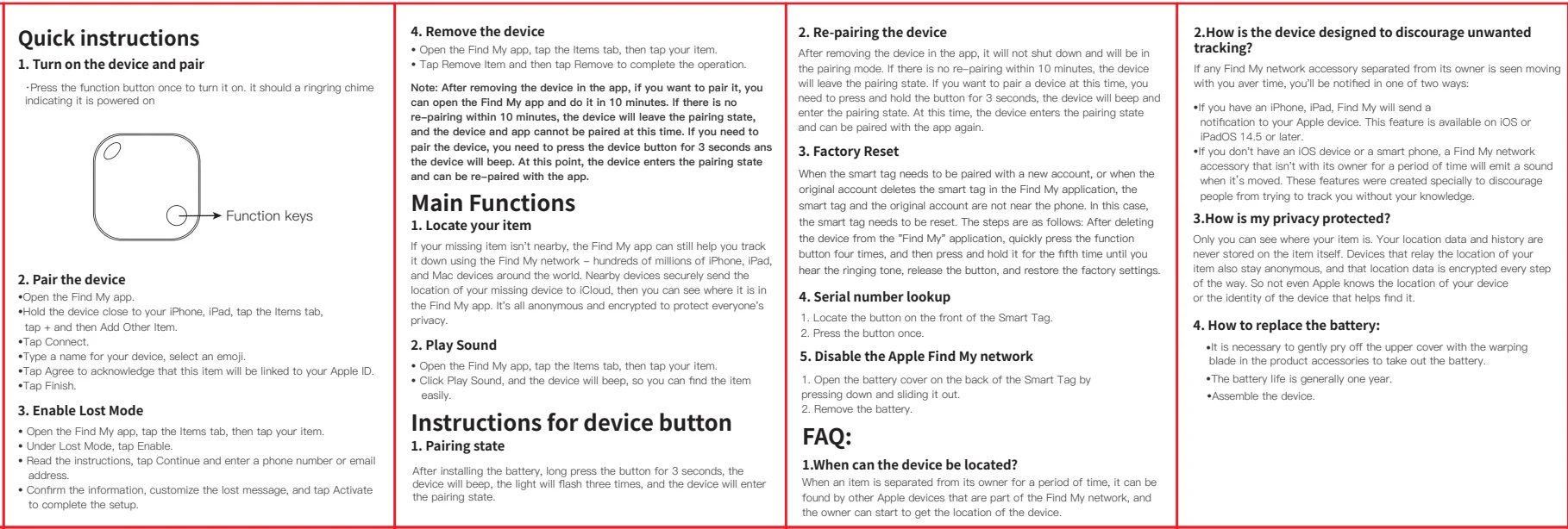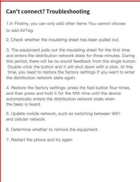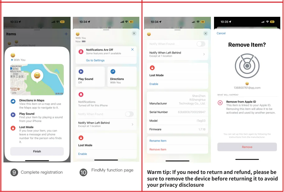 Apple ID:Установите модели iPhone и iPad touch с IOS14.5 или более поздней версии, установите модели iPad с iPad OS14.5 или более поздней версии; ваш AirTag отправляет безопасный сигнал Bluetooth, который может быть обнаружен соседними устройствами в Find My network. Эти устройства отправляют местоположение вашего AirTag в iCloud-затем вы можете перейти в найти мое приложение и увидеть его на карте. Весь процесс является анонимным и зашифрованным, чтобы защитить вашу конфиденциальность.