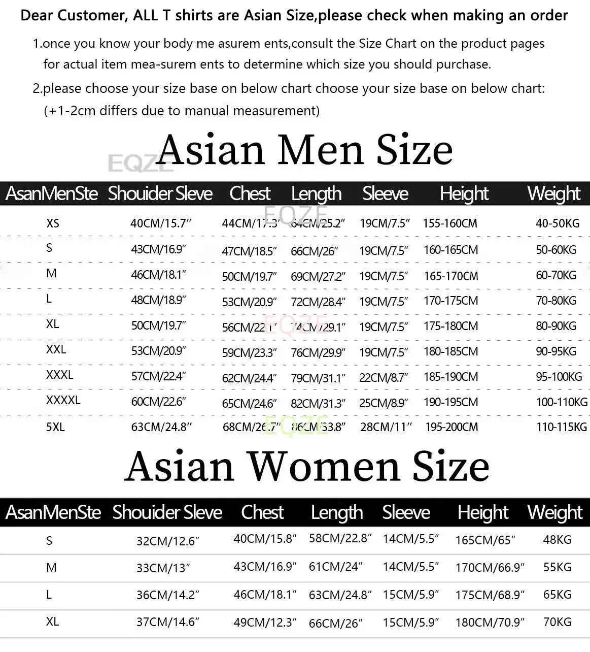 Примечание 1: Мы Азиатские размеры. Азиатский размер немного меньше, чем американский размер. 1 дюйм = 2,54 см, 1 см = 0,39 дюймов