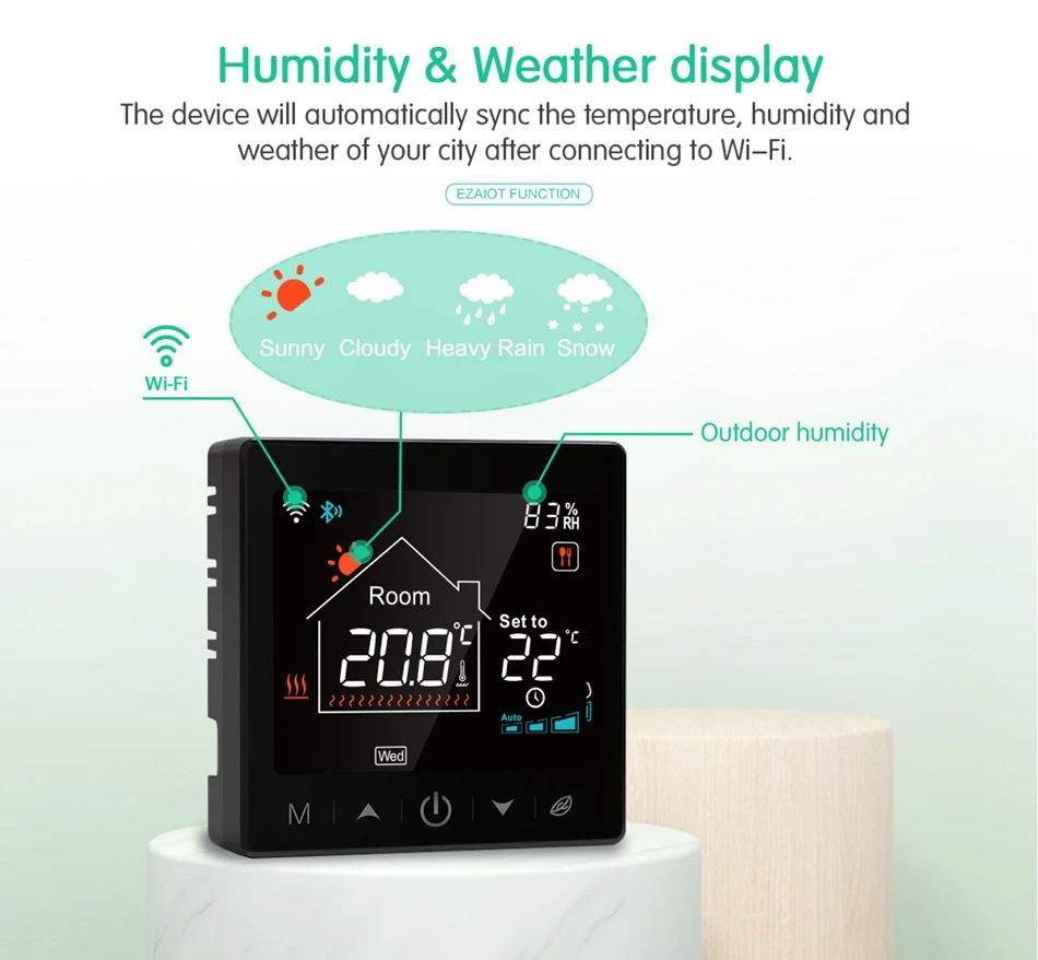 Устройство автоматически синхронизирует температуру, влажность и погоду вашего города после подключения к Wi-Fi.