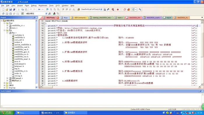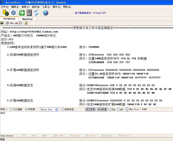 1.CAN rate automatic search interception (CAN based on OBD interface) 2. standard CAN data filtering and listening 3. extended CAN data filtering and listening 4. standard CAN data transmission 5. extended CAN data transmission 6. K line data listening