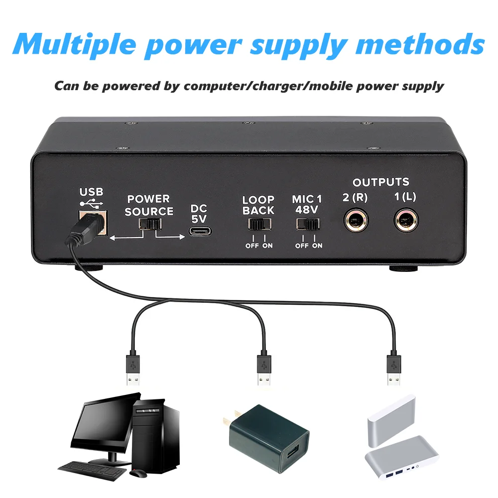 【Flexible Power Selection】 Sound card has the USB 3.0 port supports to connect with PC or iOS devices which can directly make the record and also be powered. You can also choose a standard 5V 2A USB power adapter or an external USB power bank(Not included in the box) to ensure power stability. Diversified power supply methods let you use the sound card whenever and wherever.