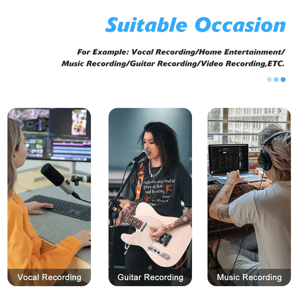 【24 bit/192 kHz High Fidelity Sound Quality】 Maximum sampling rate 24 bit/192 kHz recording audio quality,with all connection interfaces for microphone, electric guitar, bass, etc, delivers studio-grade 24-bit/192 kHz audio resolution for pristine recording every time. These accurately capture the detail of every recorded signal, ensuring that the fidelity of sound throughout the recording process is maintained.