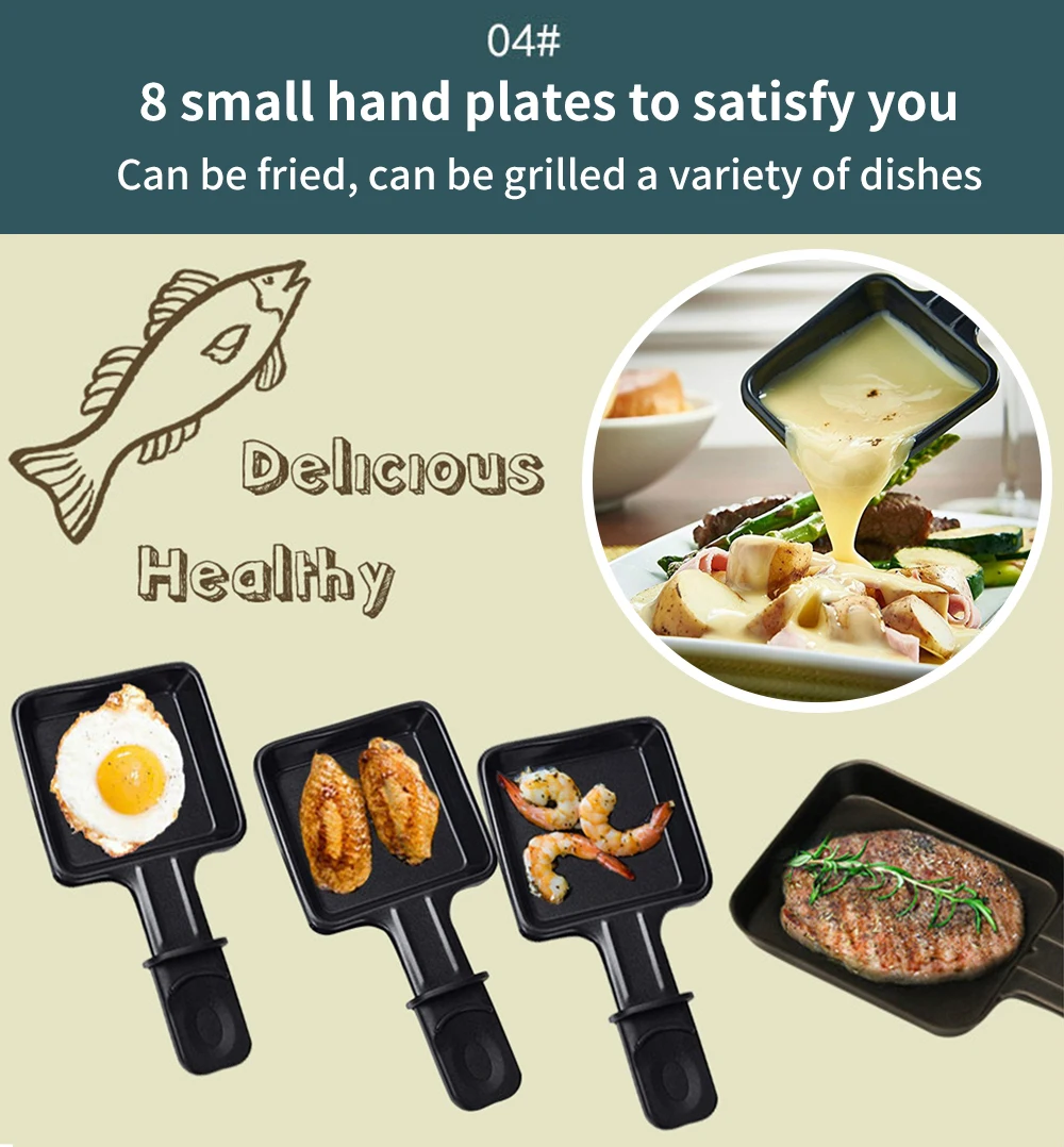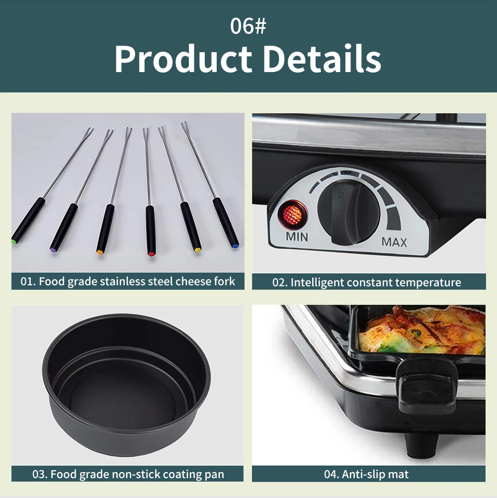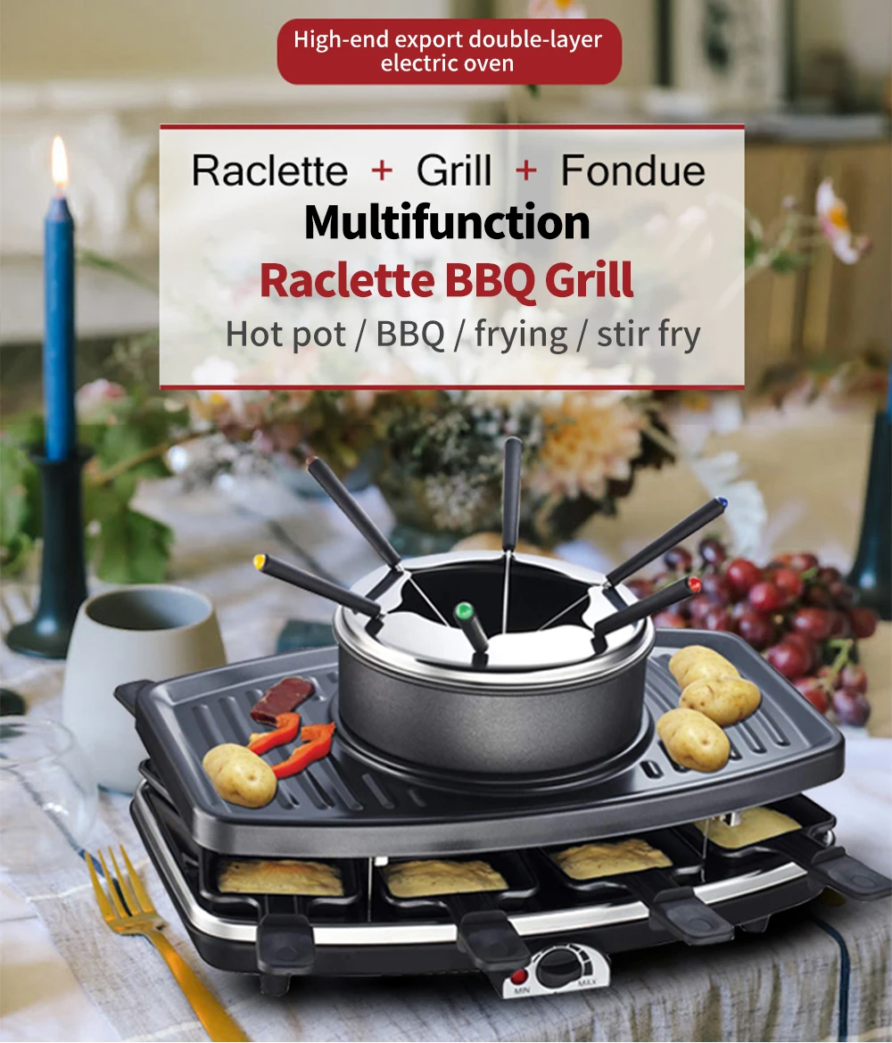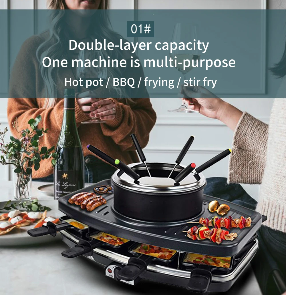 • [Универсальный набор] Универсальный Гриль для фондю, сыра и гриля. Может вместить 8 человек барбекю и 6 человек горячий горшок, с регулируемым термостатом и индикаторным светильник. Включает в себя 8 ручной посуды/6 вилок с цветными ручками