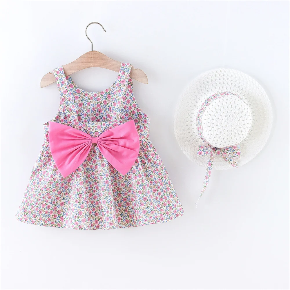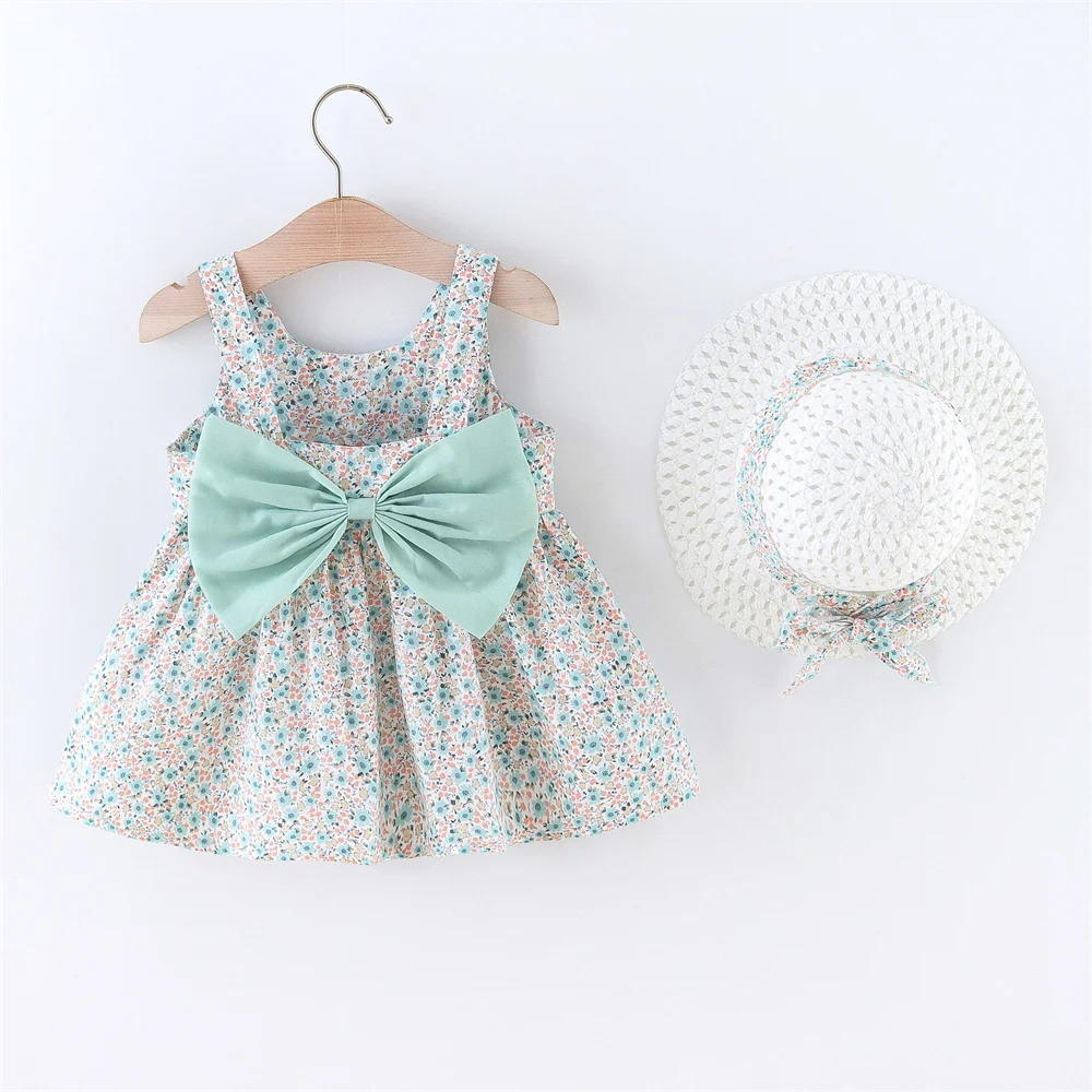 2 шт./компл., милые детские платья для маленьких девочек детская одежда с бантом летнее пляжное платье для маленьких девочек + шапочка для детей от 0 до 3 лет