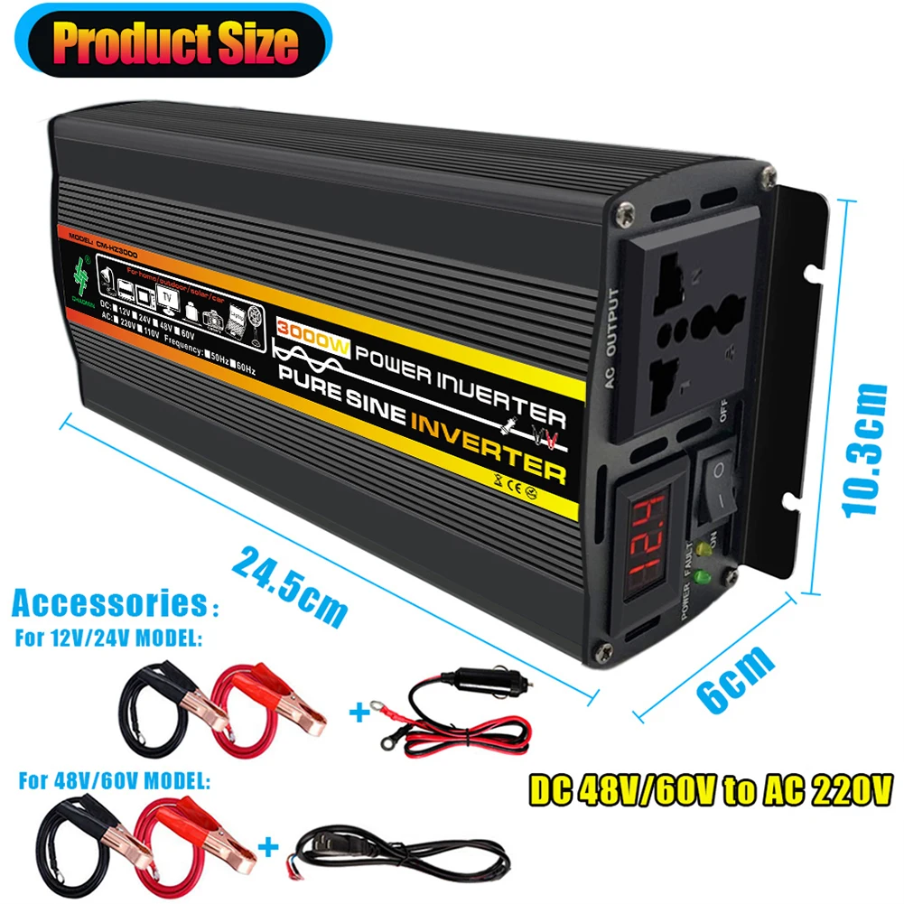 Характеристика: 1. Чистая синусоида:Инвертор чистой синусоидальной волны-преобразует 12 В/24 В/48 В/60 В постоянного тока в переменный ток 220 В домашняя настенная мощность с непрерывной выходной мощностью 500 Вт (емкость 3000 Вт) С 1 емкостью переменного тока, один светодиодный дисплей напряжения, клеммы постоянного тока с высоким током и два светодиодный лампы для работы. (Убедитесь, что общая номинальная мощность подключенных устройств ≤ 500 Вт). 2. Прочный и долговечный:Корпус из алюминиевого сплава и высокоскоростной Интеллектуальный Вентилятор охлаждения помогают уменьшить тепло. Корпус из алюминиевого сплава обеспечивает передовую защиту от падений и ударов. Встроенный охлаждающий вентилятор помогает уменьшить тепло и предотвращает перебои. 3. Светодиодный зеленый и красный рабочие огни:Когда инвертор работает нормально, два зеленый светодиодный светильник s работает, но когда он находится на состоянии защиты, красный светодиодный светильник s будет светильник. Светодиодный экран напряжения. Светодиодный дисплей показывает входное напряжение аккумулятора в режиме реального времени и напоминает вам зарядить аккумулятор в соответствии с низким напряжением. 4. Бесшумный Умный вентилятор охлаждения:Оснащенный бесшумным охлаждающим вентилятором, он будет автоматически работать с разной скоростью в зависимости от нагрузки на мощность (ватт) и температуры для рассеивания тепла и уменьшения рабочего шума. В инверторе встроен датчик температуры. Когда он превышает 45 ℃, вентиляторы будут работать автоматически. Когда температура превышает 75 ℃-80 ℃, инвертор будет находиться в режиме защиты, пока он не остынет. 5. Широкое применение:С нашим инвертором мощности автомобиля, вы можете использовать большинство бытовых приборов в вашем автомобиле на открытом воздухе, таких как смотреть телевизор, играть в игры, дать вам опыт, как быть в RV. Отлично подходит для рождественского подарка, зарядки телевизора, кондиционера, хладагента, микроволновой печи и большого электроприбора. Они могут работать только с несколькими нагрузками 220 В без помех. Также можно использовать в автомобиле или солнечной системе. Спецификация: Модель: HZ3000 Материал: алюминиевый сплав + ABS Цвет: черный Дисплей: светодиодный цифровой дисплей Входное напряжение: 12 В/24 В/48 В/60 в по желанию Выходное напряжение: 110 В переменного тока/220 В опционально Выходная частота: 50 Гц Максимальная мощность: 3000 Вт Номинальная мощность: 500 Вт Размер продукта: около 21x10.3x 6 см/8.27x4.06x2.36inch Вес: 1100/1400/1700 г Максимальная активная импульсная Номинальная мощность (менее 1 с): 3000 Вт Максимальный ток переменного тока на гнездо: 8,33 ампер Форма выходного сигнала: Истинная/Чистая Синусоидальная волна (<3% THD) Эффективность: ≥ 90% Без нагрузки тока (сторона постоянного тока) <0,6 A Сценарий применения: дом на колесах, бытовая техника и т. Д. 12 В, как правило, для автомобилей, 24 В для грузовиков, 48 В и 60 в, как правило, для электромобилей. Доступный Диапазон номинального напряжения электроприборов: 210-230 В, 110-130 в Безопасный Диапазон входного напряжения: 12V: 9,8-15 в 24 В: 20-28 в 48 В: 44-53 в 60 в: 58-68 в 8 функция защиты безопасности: Защита от обратной полярности Защита от низкого входного напряжения Защита от высокого входного напряжения Защита от перегрузки по току Защита от короткого замыкания Защита от перегрева Защита от пер