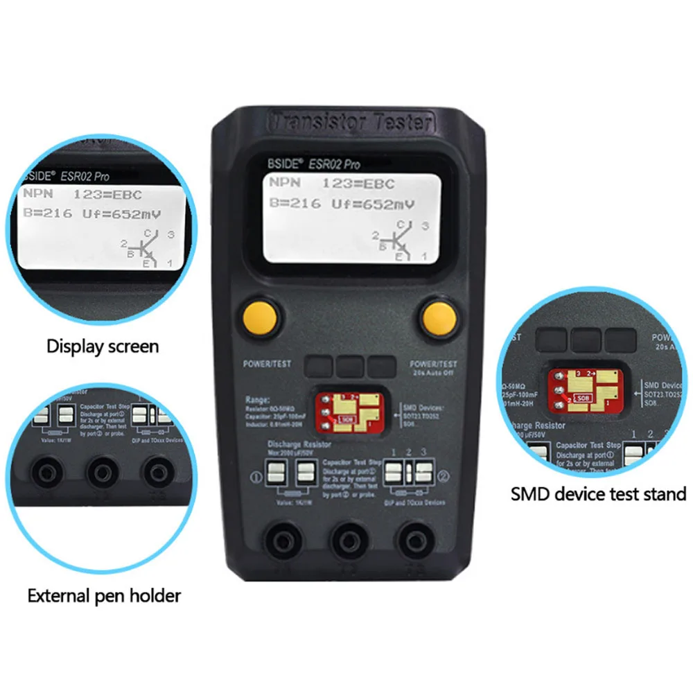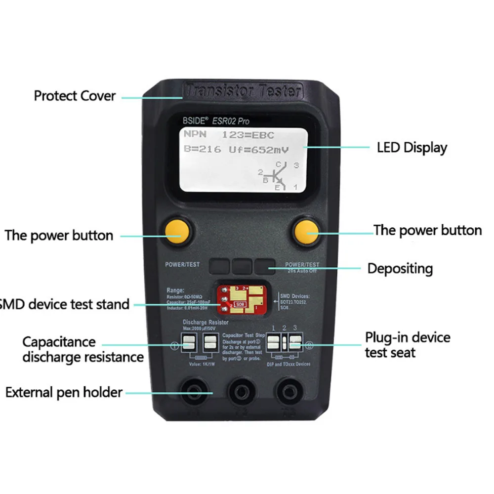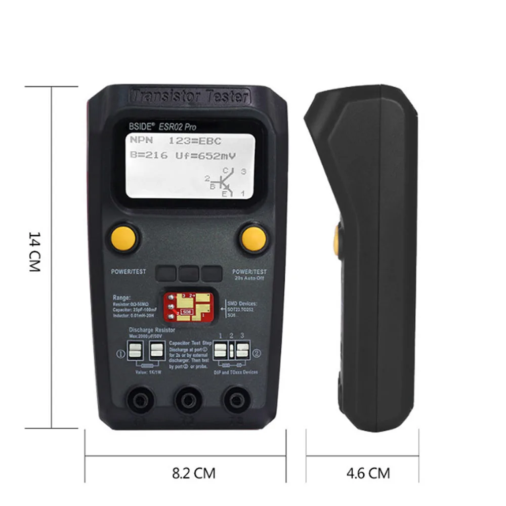 Многофункциональный транзистор тест er ESR02pro Smart ESR/SMD диодный Триод емкостной резистор измеритель MOS/PNP/NPN тест с тестовым зажимом Очень легко тестировать подключаемые и SMD устройства, также могут тестировать различные виды диодов, триодов, тиристоров, МОП-транзисторов, позволяют анализировать тип устройства, полярность штыря, выход HFE, напряжение клапана, емкость соединения FET. Особенности: 1. Две кнопки, автоматическое выключение. 2. Только 20na от тока. 3. Автоматическое обнаружение NPN, PNP биполярных транзисторов, n-канальных и p-канальных МОП-транзисторов с полевым эффектом, транзисторов, диодов, диодов, тиристоров, низкомощных однонаправленных и двунаправленных тиристоров. 4. Автоматическая идентификация компонентного штифта. 5. Измерение коэффициента усиления тока и порогового напряжения биполярных транзисторов. 6. Определение транзисторов Дарлингтона с помощью базового эмиттера порогового напряжения и коэффициента усиления высокого тока. 7. Может обнаруживать биполярные транзисторы и МОП Транзисторные защитные диоды. 8. Измерение порогового напряжения и емкости ворот MOS FET. 9. Он может измерять два сопротивления одновременно и отображать символы сопротивления. Справа отображается десятичное значение 4. Символы резистора с обеих сторон показывают контактный номер. Таким образом, вы можете измерить потенциометр. Если потенциометр стеклоочистителя не смещается в крайнее положение, мы можем различить середину и концы иглы. 10. Разрешение измерения сопротивления составляет 0,1Ω, и оно может измерять 50MΩ. 11. Может измерять емкость 325pf-100mf с разрешением 1pf. 12,2 мкФ более конденсаторы могут измерения эквивалентного последовательного сопротивления значение в одно и то же время. Оба могут отображаться как десятичные значения с разрешением 0,01 Ω. 13. Два диода могут отображаться в правильном порядке и символе диода, и приведено прямое напряжение диода. 14. Светодиодный индикатор обнаружен как диод с высоким передовым напряжением. Комбинация светодиодов определяется как два диода. 15.eeverse Разрывное напряжение составляет менее 4,5 v зенеровский диод может быть определен. 16. Можно измерить одну диодную обратную емкость. Обратная емкость коллектора или эмиттера может быть измерена, если биполярный транзистор подключен к базе и коллектору или эмиттеру штыря. 17. Может быть соединен с одним мостом выпрямителя измерения. Спецификация: Сопротивление: 0Ω-50MΩ. Разрешение: 0.01Ω. Емкость: 25pf-100mf Разрешение: 1pf Индуктивности: 0,01 mH 20 гн. Разрешение: 0.01mH Измерение емкости ESR Разрешение: 0.01Ω Примечания: Перед тестированием конденсатора убедитесь в его разрядке, в противном случае это может повредить внутреннюю цепь. При использовании источника постоянного тока выберите адаптер 9 В-12 В (включая 9 В и 12 В). Может питаться от аккумулятора 9 в 6LR61 (аккумулятор не входит в комплект), когда питание аккумулятора составляет менее 6 в, замените новый. Инструкции по использованию: Нажмите «мощность/Тест» для включения и запуска теста, несколько измерений могут быть повторены с помощью этой кнопки, Автоматическое отключение питания через 20 секунд после измерения. Предоставляем три вида розеток, Каждый штырь 1, штырь 2 и штырь 3 подключены. Есть таблица «типичное значение ESR электролитического конденсатора» сзади, она предназначена только для руководства, это типичное значен
