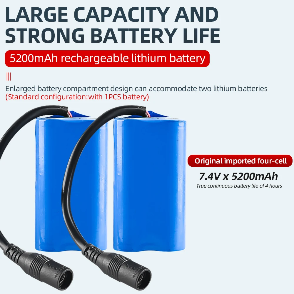 Литиевая батарея заряжается быстрее и имеет большую емкость. Отсек батареи расположен в середине корпуса, который может играть хорошую роль в балансировке и стабилизации, и имеет лучшую производительность; Отсек батареи увеличен для размещения двух аккумуляторов 5200 мАч, И срок службы батареи в два раза.