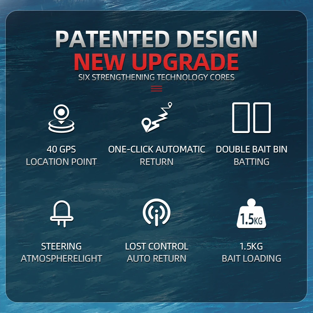40 рыболовных точек можно запоминать и расположить, автоматический круиз, подача с фиксированными точками, автоматическое возвращение.