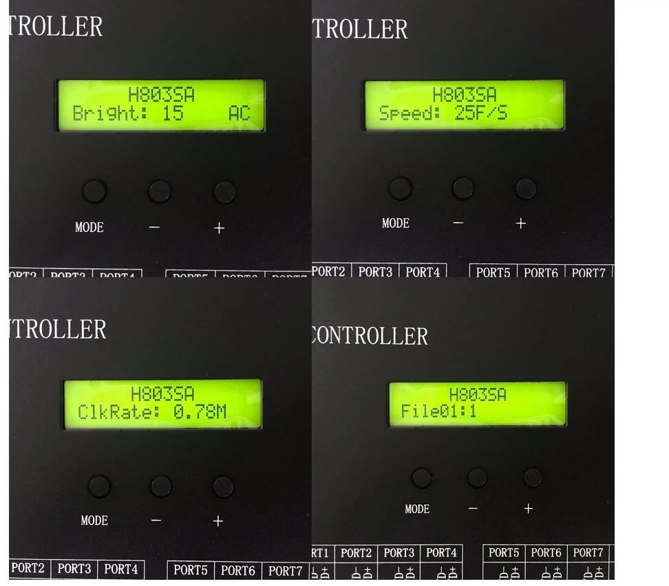With the help of H803SA controller you will be able to control and display text/images on LED RGB modules. Programs are recorded on an SD card. H803SA has eight output ports, drives maximum 8192 pixels. Three buttons and LCD screen are convenient for operation. Can be synchronized with AC power supply and connected to DMX console.