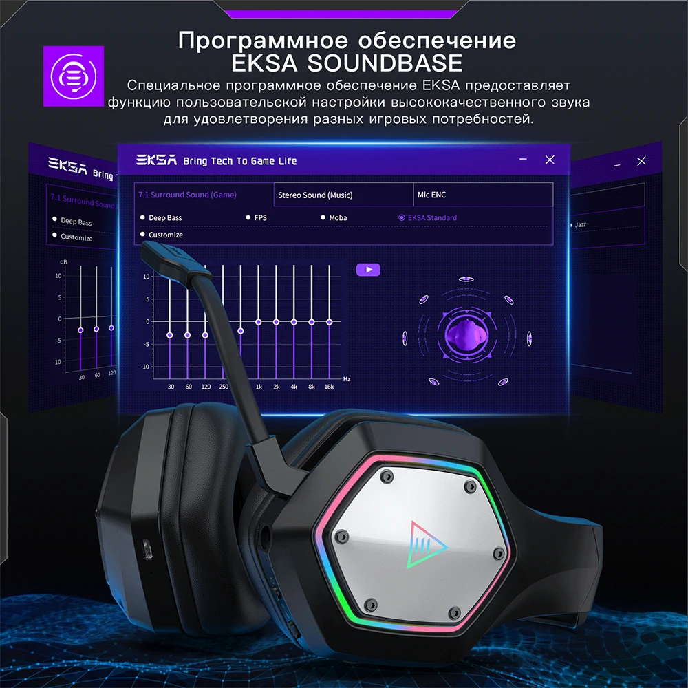Наслаждайтесь виртуальным окружающим звука последней версии 7.1 с помощью игровых наушников EKSA E1000 WT. Программа EKSA SoundBase предоставляет функцию пользовательской настройки высококачественного звука для удовлетворения разных игровых потребностей. Скачать пользовательский драйвер со страницы для загрузки.Улучшается ваше командное общение с помощью EKSA VoicePure ENC. Технология подавления окружающего шума может изолировать звук от шума и удалять до 96% отвлекающего фонового звука. Вы будете озвучиваться реальным и четким голосом в игровых чатах, что дает вам дополнительное конкурентное преимущество.