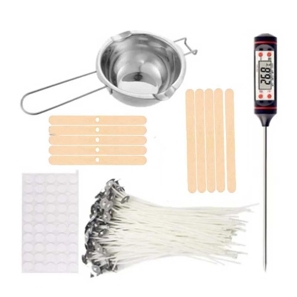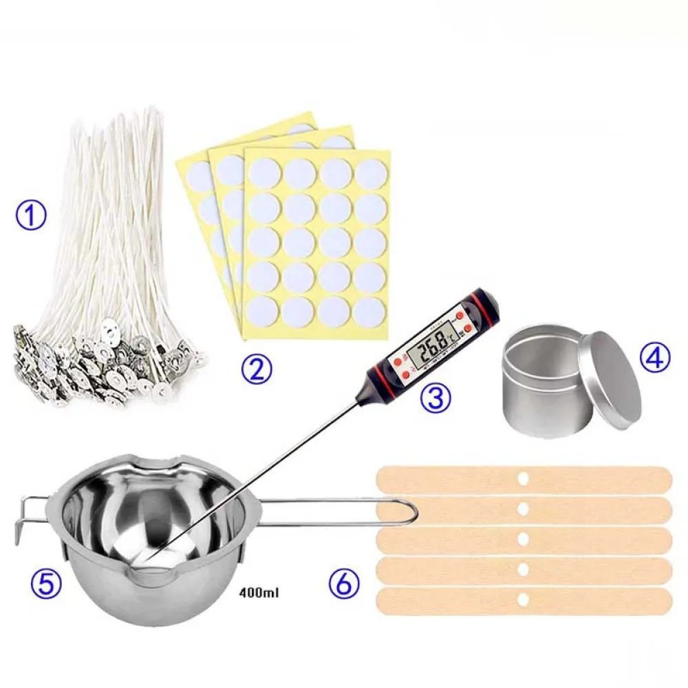 Комбинация воска и термометр весит около 288 г, длина 27,5 * ширина 16,5 * высота 7 см, 400 мл Горячий Воск горшок, 4 помешивая стержни, 50 фитиль наклейки, термометр, 50 10 см фитили, 5 держателей деревянных чипов