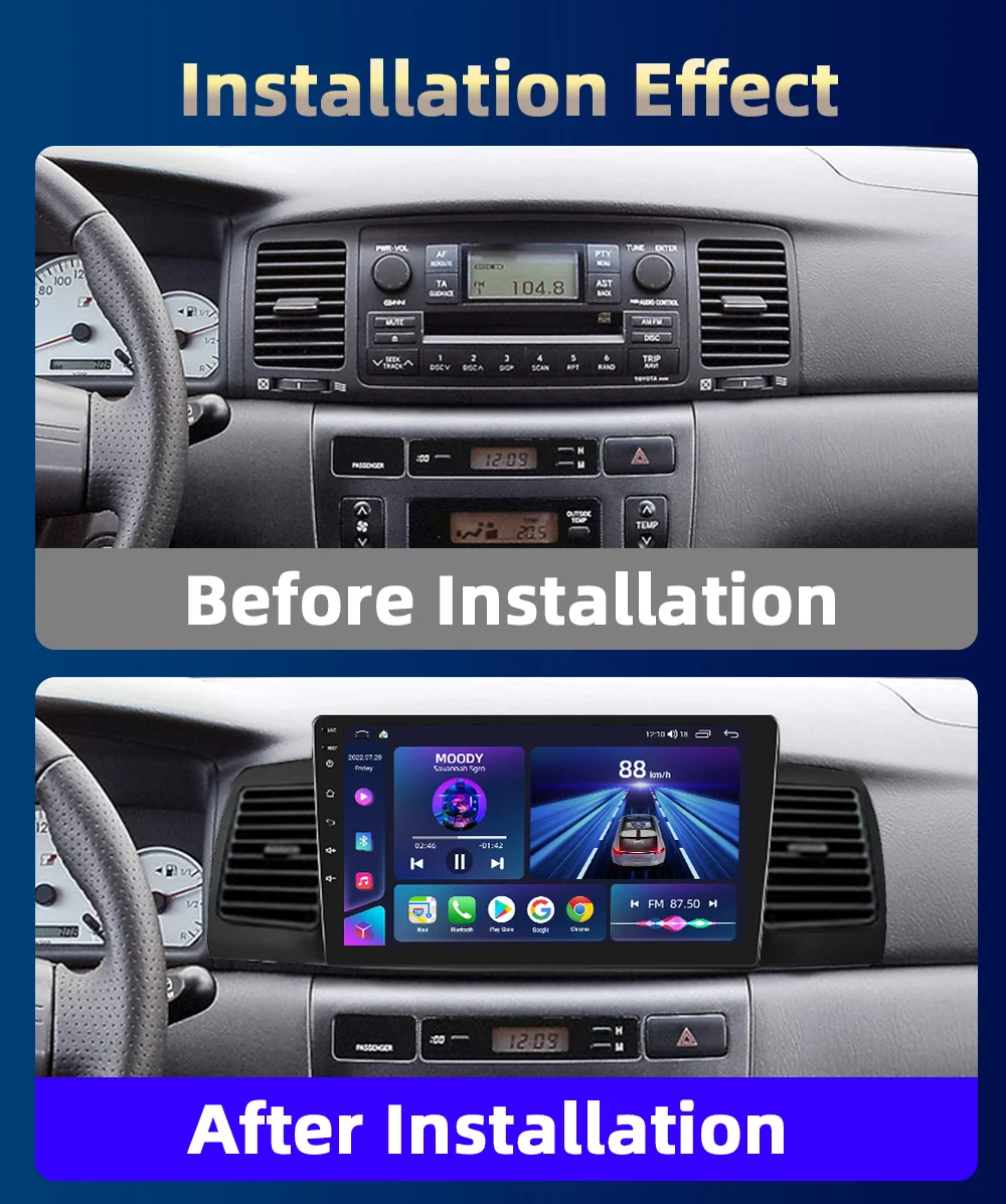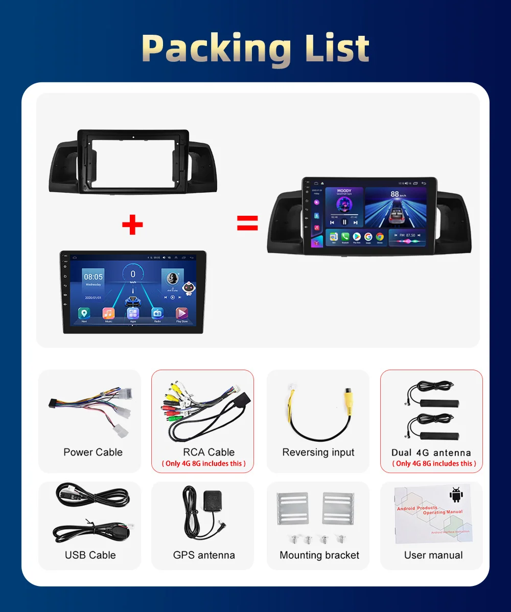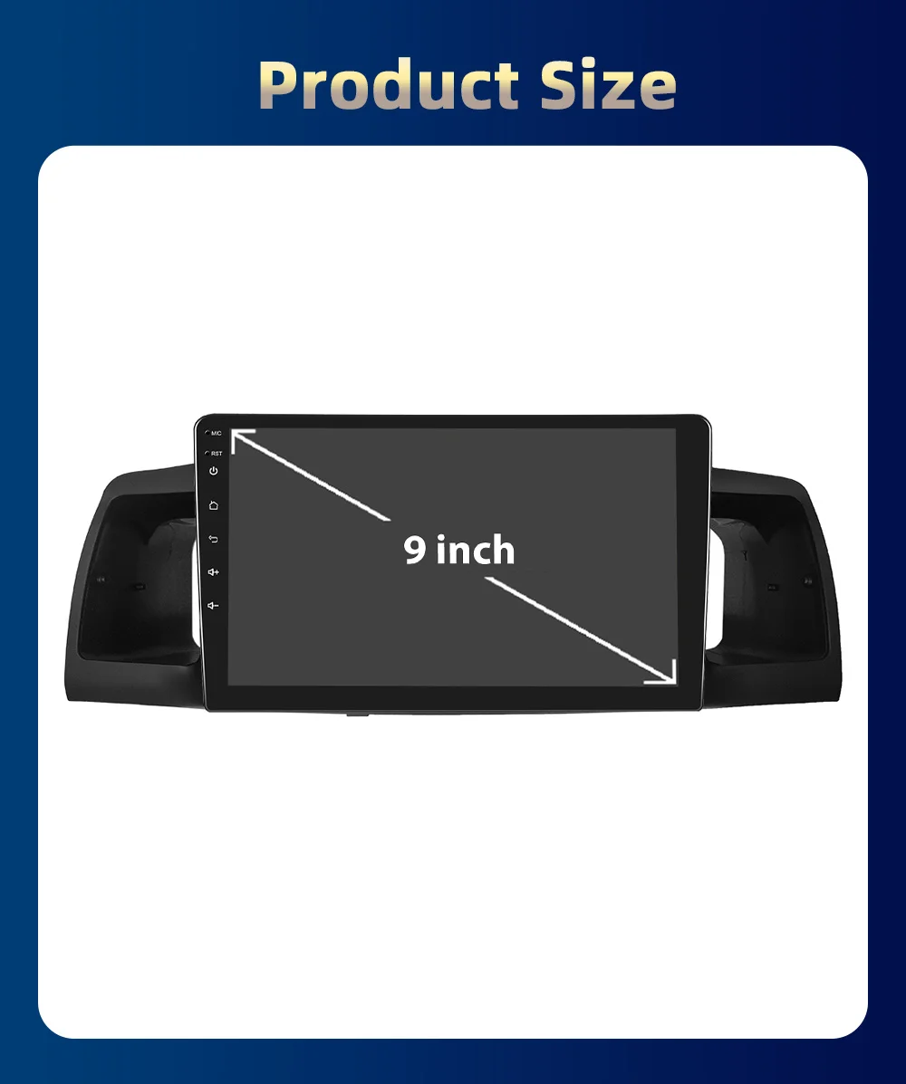 > Basic functions: Android 9/10.0/11 + IPS/Qled Screen + Quad Core 1.2GHZ (Eight core 1.8GHZ optional)+16 GB Memory (32GB/64GB/128GB optional) + WIFI (4G Network optional)+ Mirror link+ Steering Wheel Control + RDS/DSP(optional)+Android Auto(optional)+Carplay(optional)