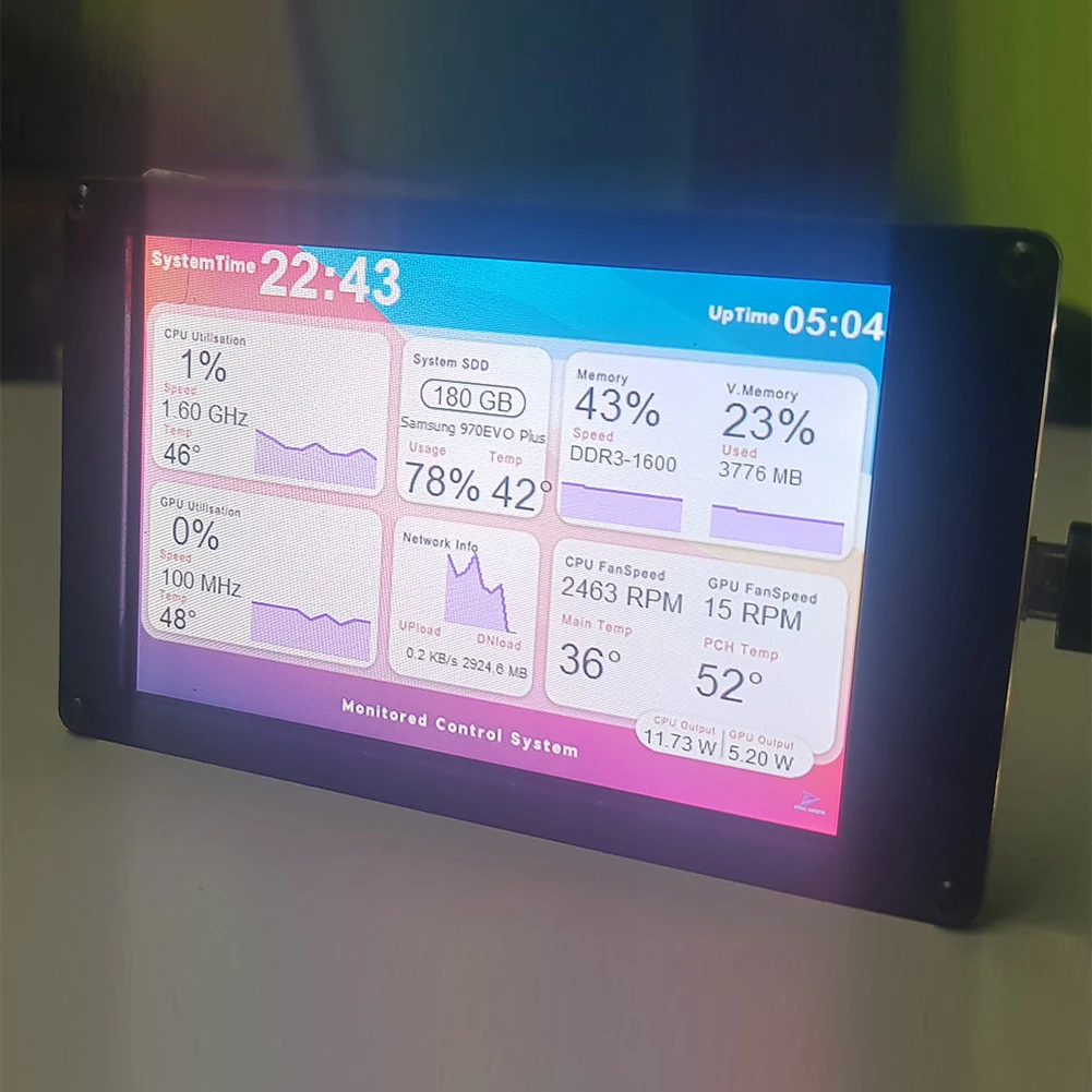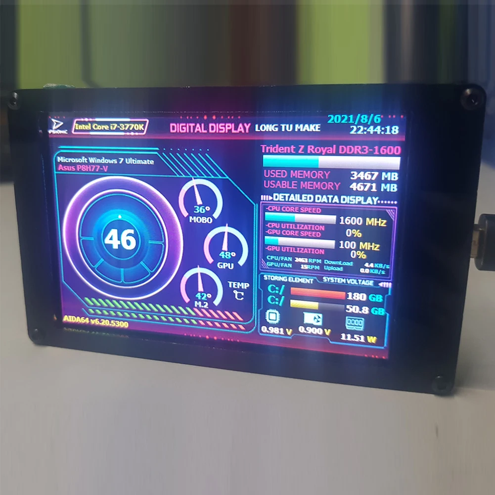 4. Множественный мониторинг:На этом экране будут отображаться данные процессора, GPU, RAM, HDD, времени и даты. Управление одной кнопкой, визуальное изменение темы, изменение фона одной кнопкой, изменение темы одной кнопкой, только одна линия передачи данных, без дополнительного источника питания. Программное обеспечение будет автоматически запущено, когда компьютер включен, и последующее использование экрана будет автоматически запускаться, не занимаясь ресурсами видеокарты.