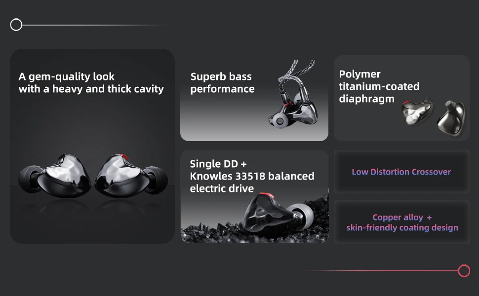 Сбалансированный Электрический привод Knowles 33518 также используется в движущемся железе, и используется новый 10 мм полимерный композитный мембранный Динамический драйвер с титановым покрытием, который имеет лучшую динамическую и переходную производительность.