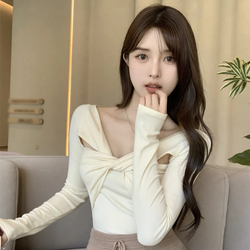Весенне-осенняя модная повседневная одежда в Корейском стиле в стиле чистого желания, сексуальная универсальная одежда, Простой Тонкий однотонный необычный дизайн, топ с v-образным вырезом и длинными рукавами