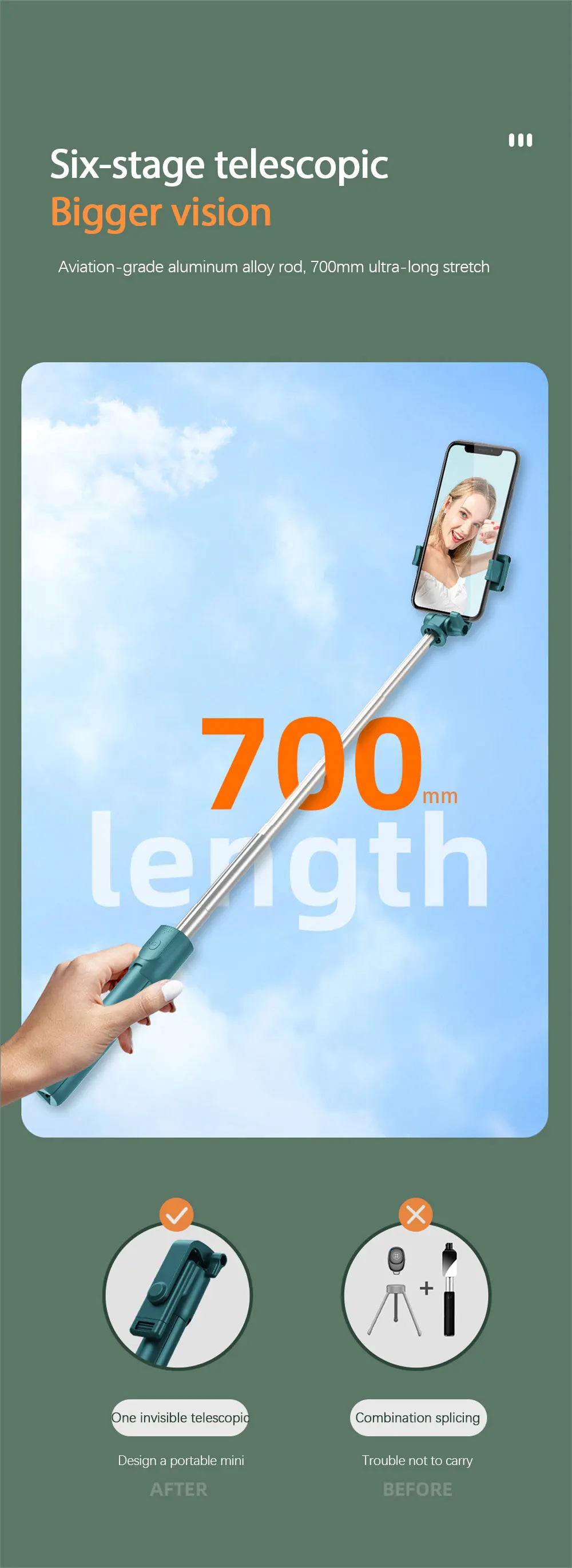 2. 【Mini и portable】скрытый кронштейн, телескопический и складной дизайн, занимает любое пространство, не занимая места.