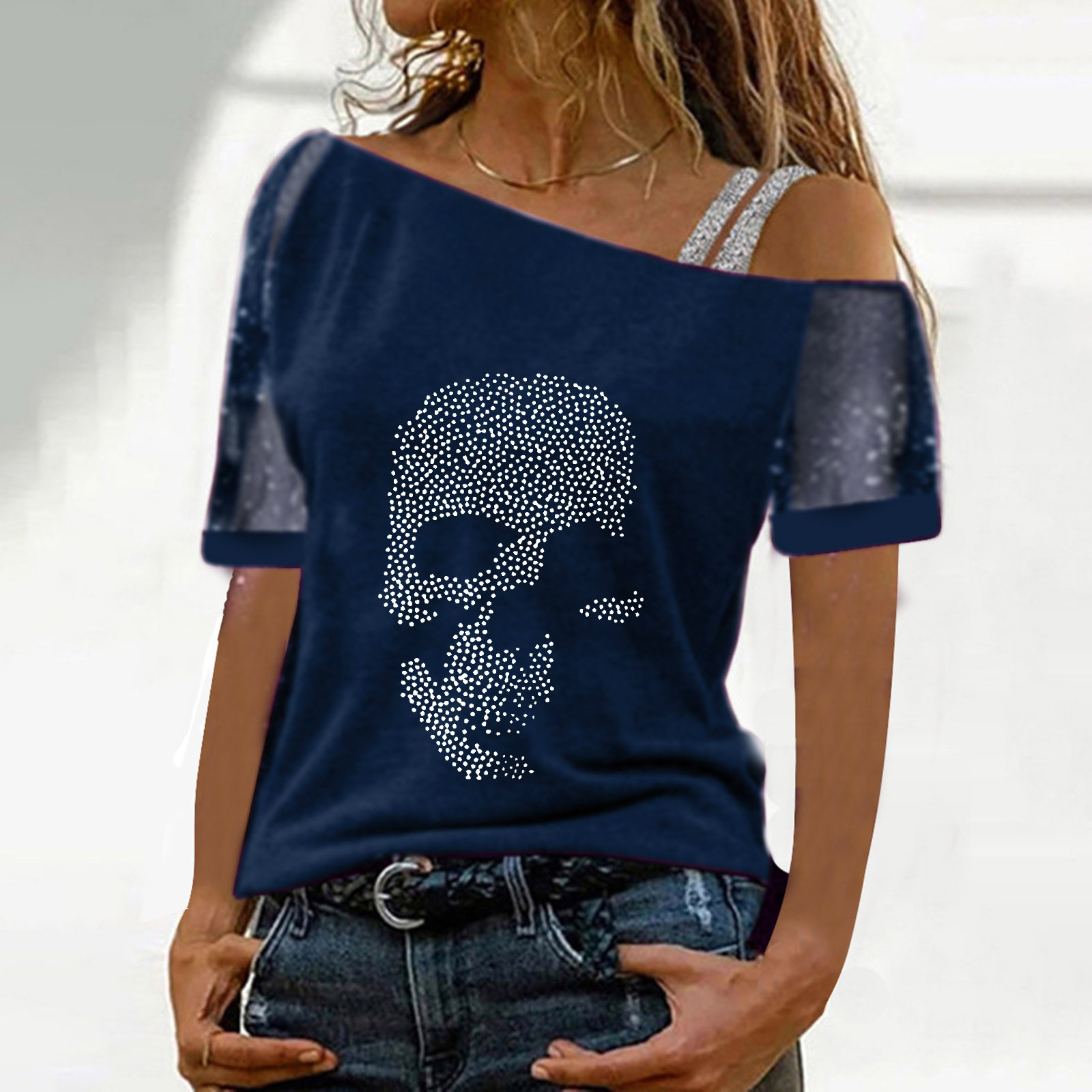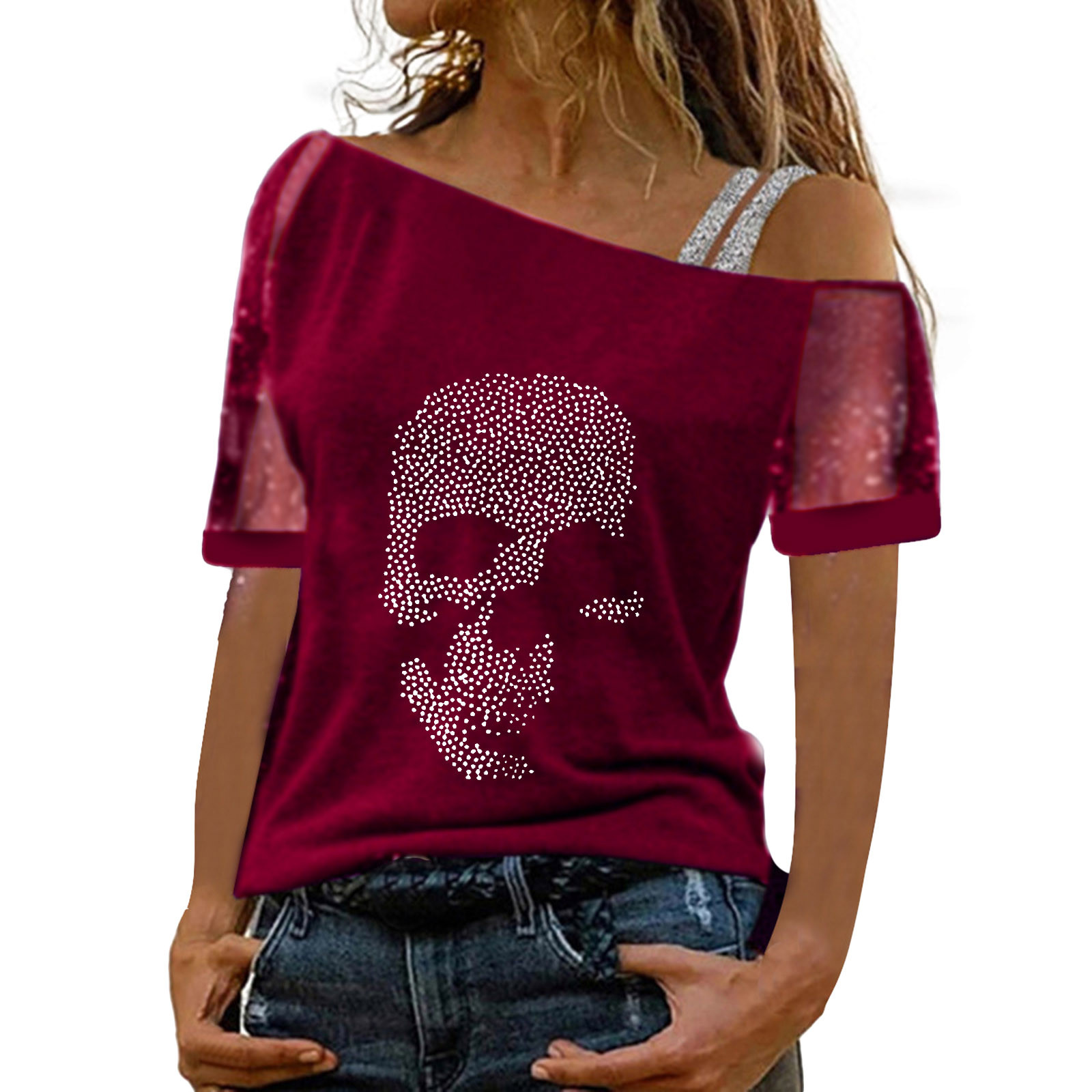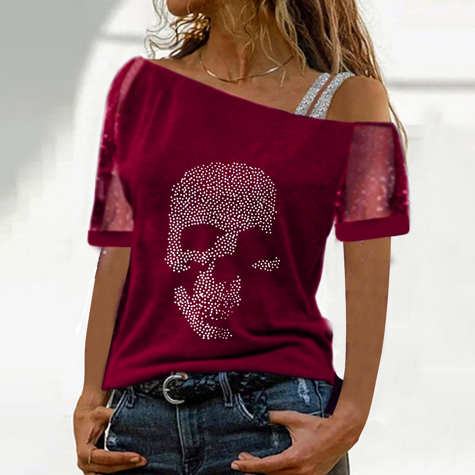 Женские топы с открытыми плечами и принтом, сексуальная блестящая рубашка с коротким рукавом, блузки, топы