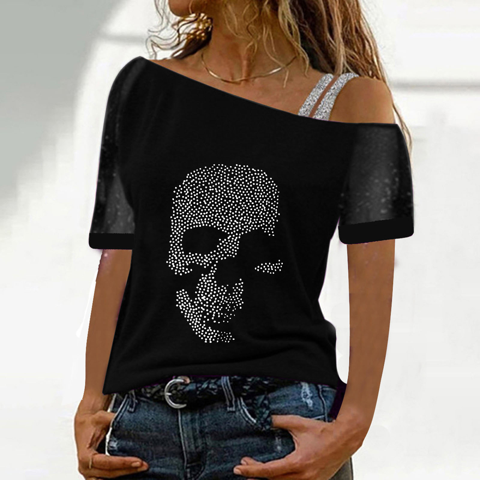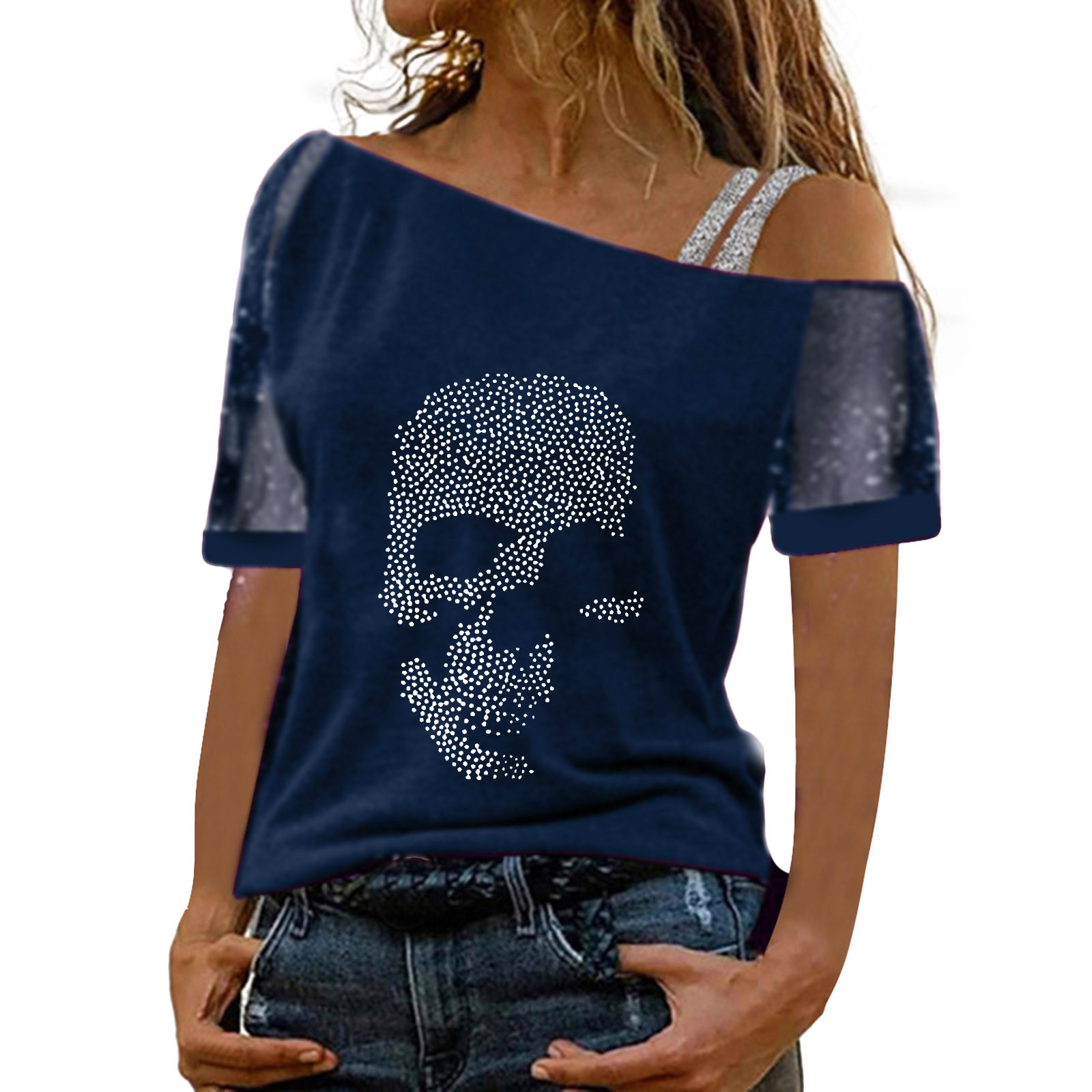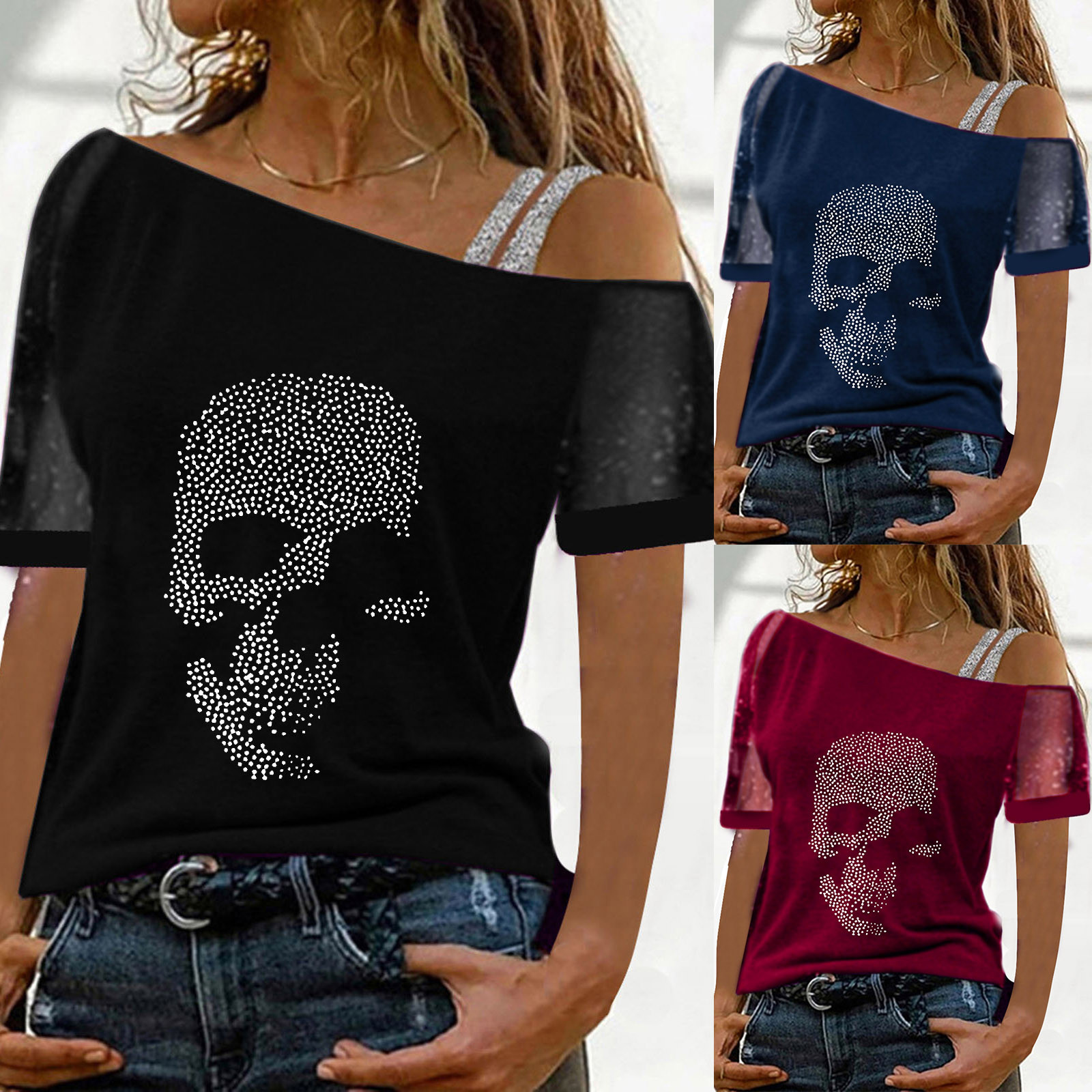 Женские топы с открытыми плечами и принтом, сексуальная блестящая рубашка с коротким рукавом, блузки, топы