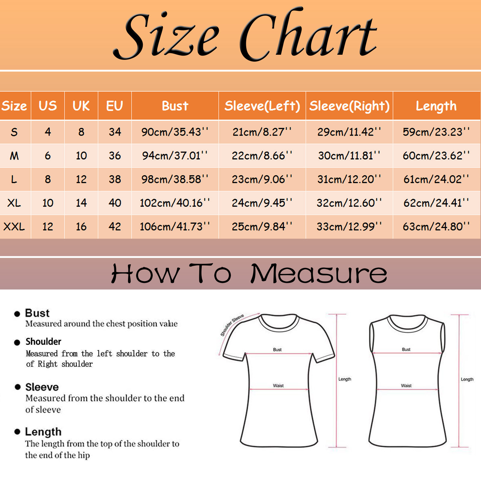 | Размеры | США | Великобритания | ЕС | Бюст | Рукав (слева) | Рукав (справа) | Длина |