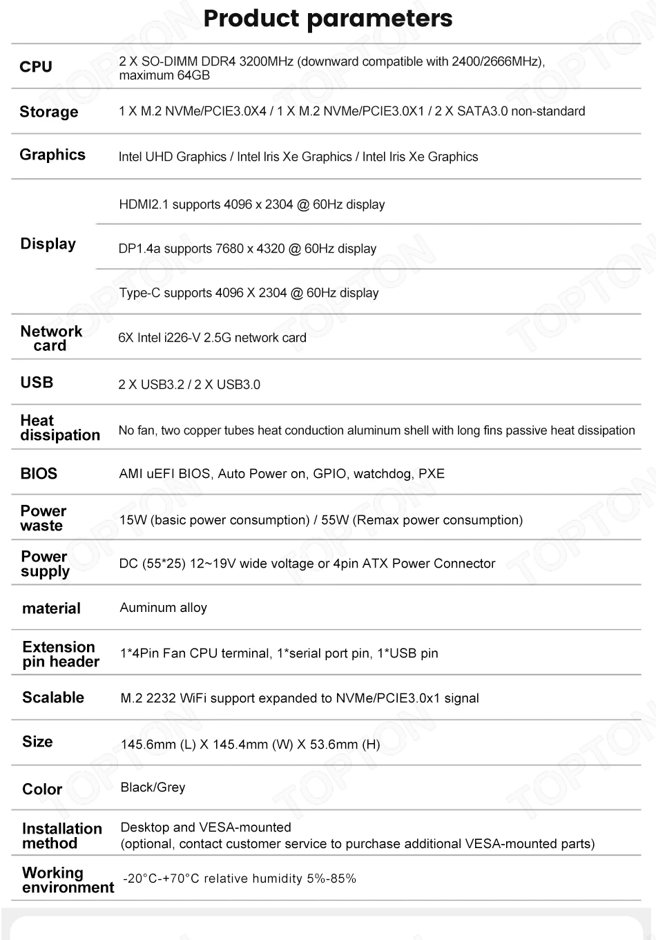 -Низкое потребление TDP 15W и может быть установлен на задней части монитора с помощью кронштейна VESA (опционально).