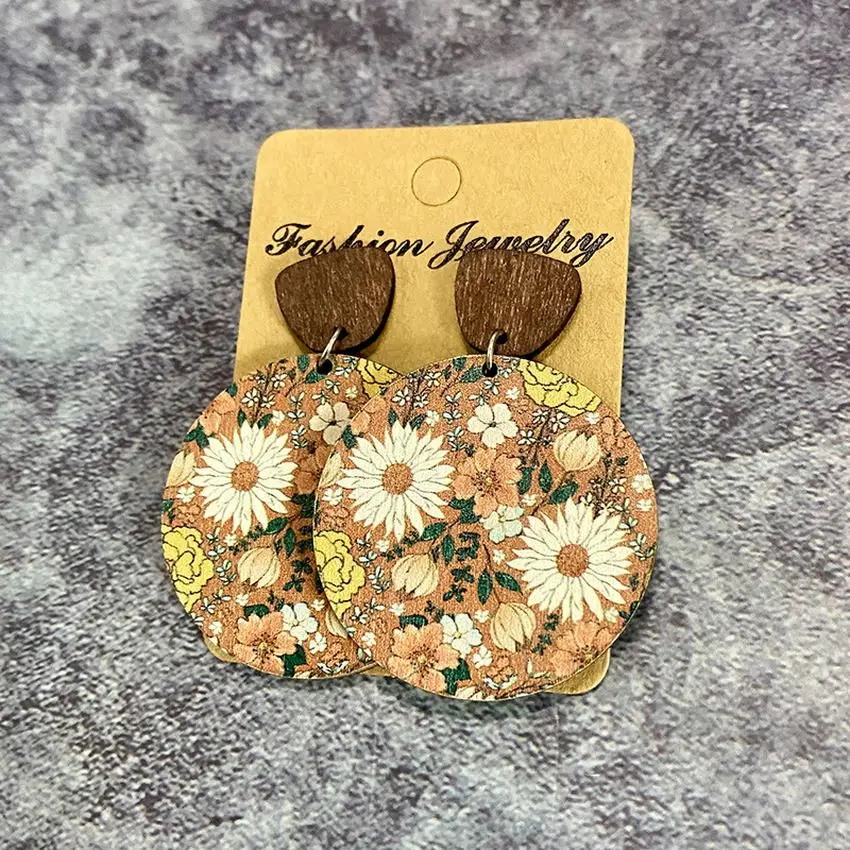Круглые деревянные весенние цветочные серьги для женщин, новинка 2023, УФ-принт, Подсолнух, маргаритки серьги, Юго-западные ювелирные изделия, оптовая продажа