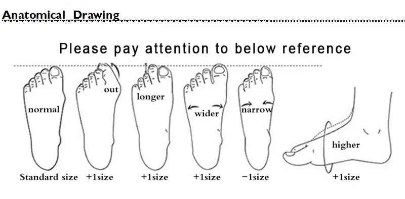 1. Размеры-максимальный размер,Пожалуйста, позвольте ошибке около ± 5 мм. Перед заказом внимательно сравните таблицу размеров с длиной стопы.