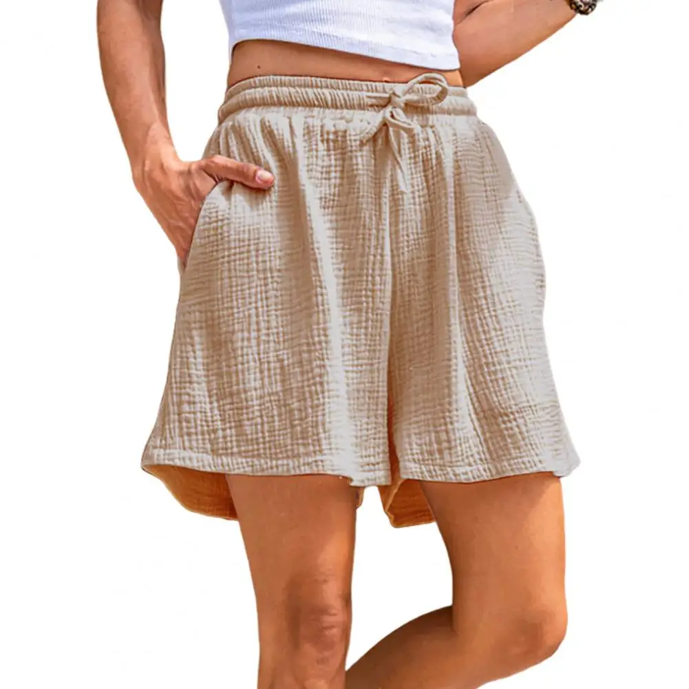 Однотонные шорты, стильные женские шорты с эластичной талией и шнурком с карманами, свободные короткие брюки с широкими штанинами для лета, повседневные