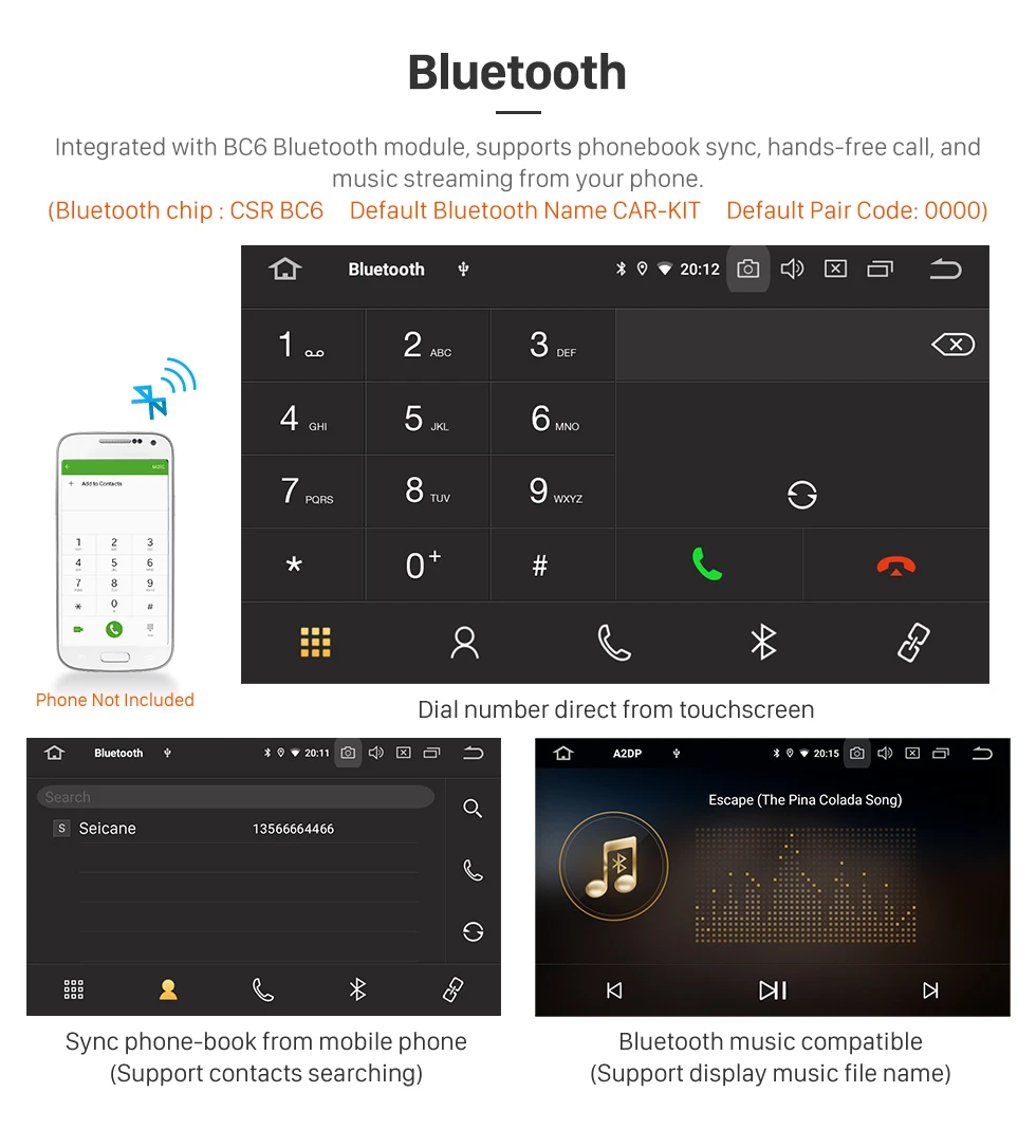 Bluetooth:Он обновляет ваш автомобиль с модулем BC6 Bluetooth для звонков без рук и потоковой передачи музыки. С мелодиями звонка и голосом, выходящими из автомобильных динамиков, вы можете набрать, ответить, отклонить и отключить звонки, не снимая руки с руля. Функция телефонной книги позволяет осуществлять поиск контактов непосредственно на большом экране головного устройства. Также желательно передавать любимые мелодии со смартфона по беспроводной сети. Внутренний микрофон входит в комплект для разговора без искажений.