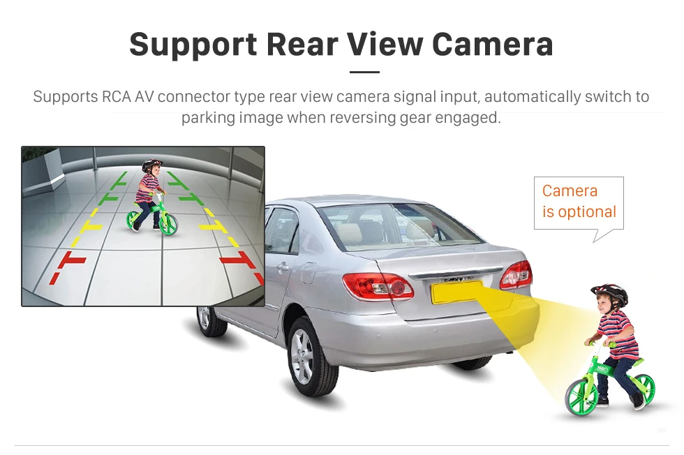 Резервная камера:Он добавляет резервную камеру для автоматического переключения на изображение парковки во время заднего хода. Этот вариант включает в себя водонепроницаемую и камеру ночного видения, которая будет установлена в положение номерного знака вашего автомобиля и кабели для его подключения. Проводная камера заднего вида по умолчанию. Если вам нужен беспроводной, пожалуйста, отправьте нам сообщение после размещения заказа.