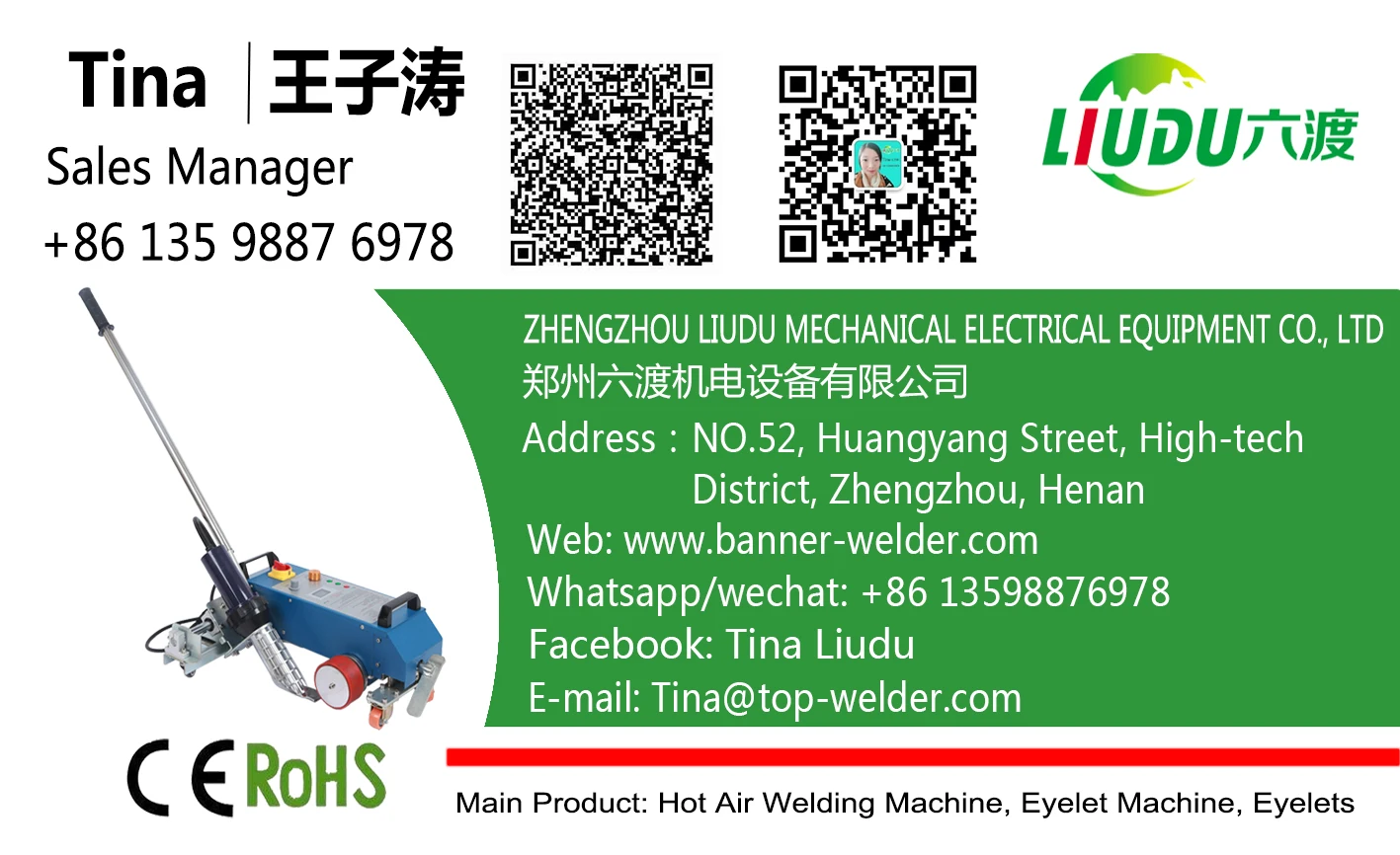 Zhengzhou LIUDU Mechanical Electric Equipment Co., ltd. является профессиональным производителем сварочного аппарата с горячим воздухом и люверсов. Мы специализируемся на производстве сварочного аппарата горячего воздуха в течение 10 лет, наша продукция экспортируется в более чем 60 стран и регионов. Наш центр исследований и разработок, принадлежащий компании, получил 19 национальных патентов, цифровую постоянную температурную систему, встроенную систему подвески, автоматическую систему защиты функций покоя, высокую мощность и высокую эффективность и т. д. Все они находятся в абсолютном лидирующем положении в отрасли. Профессиональная команда послепродажного обслуживания компании обещает создать национальный механизм послепродажного реагирования в течение 24 часов (за исключением зарубежных и праздничных дней). Основываясь на ориентированной на клиента, ориентированной на технологии и качество философии бизнеса, мы стремимся предоставлять высококачественную продукцию и качественные услуги клиентам по всему миру.