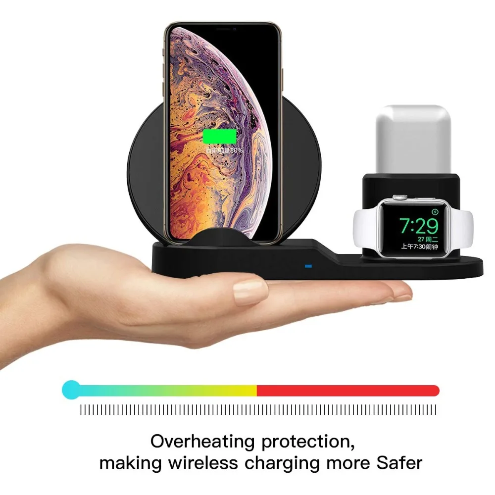 Характеристика: 3 в 1 Многофункциональное Беспроводное зарядное устройство: идеально заряжает ваш iPhone/Apple Watch /Airpods/в то же время, только нужен Кабель-адаптер может питать все устройства apple Для APPLE WATCH, версии и AIRPODS Подставка для зарядки: Встроенный Watch с магнитным креплением Зарядное устройство, совместим с Apple Watch Series 4/3/2/1, совместимый с для Airpods обеспечивает вам опрятный Подставка для зарядки. Отличный дизайн: 3 в 1 дизайн не только зарядная станция, но и подставка для телефона, держите вашу тумбочку аккуратной и аккуратной, попрощайтесь с бесконечным запутыванием шнуров. Совместимое устройство телефона: части телефона Поддержка 7,5 Вт Беспроводное зарядное устройство для быстрой зарядки совместим с iPhone XS/Xs Max/XR/X/8/8 Plus,10 Вт совместим с Samsung Galaxy S9/S9 Plus/Note 9/Note 8 (Используйте адаптер питания 9 В/1,67 А). Спецификация: Цвет: черный/белый Вход: 5V 2A,9V 2A Мобильный телефон Беспроводной зарядки Мощность: 10 Вт, 7,5 Вт, 5 Вт Для Apple Watch Выходная мощность: 2 Вт Для Airpods Выходная мощность: 3 Вт Стандарт: стандарт Qi Посылка включает в себя: 1 * Беспроводная зарядная станция