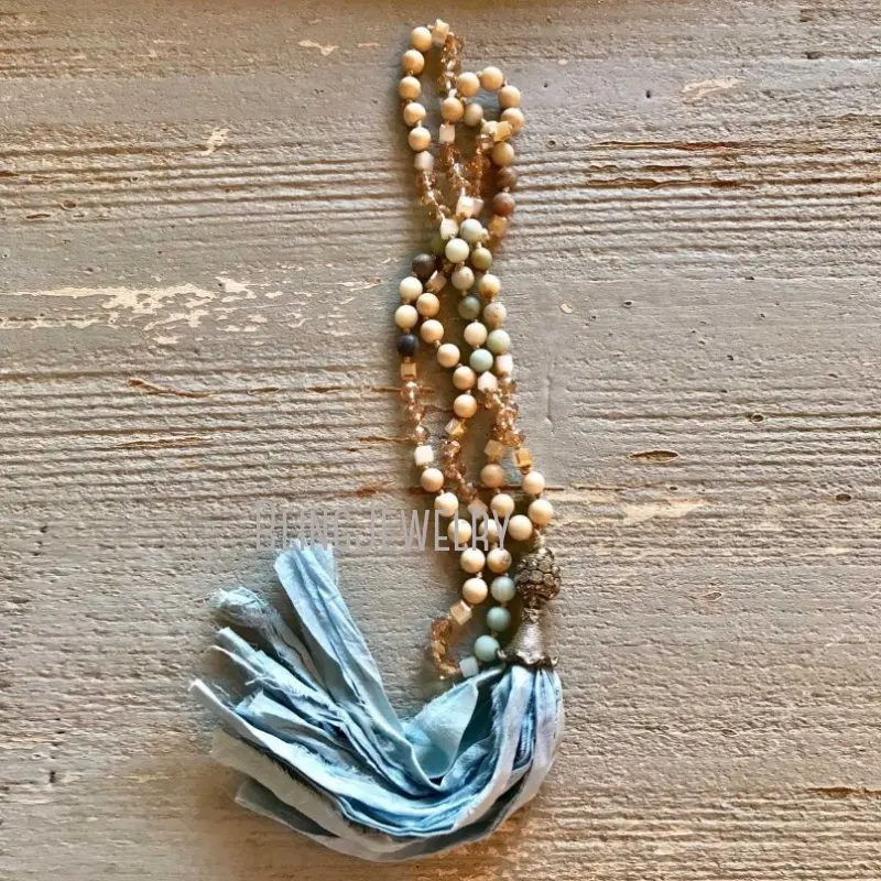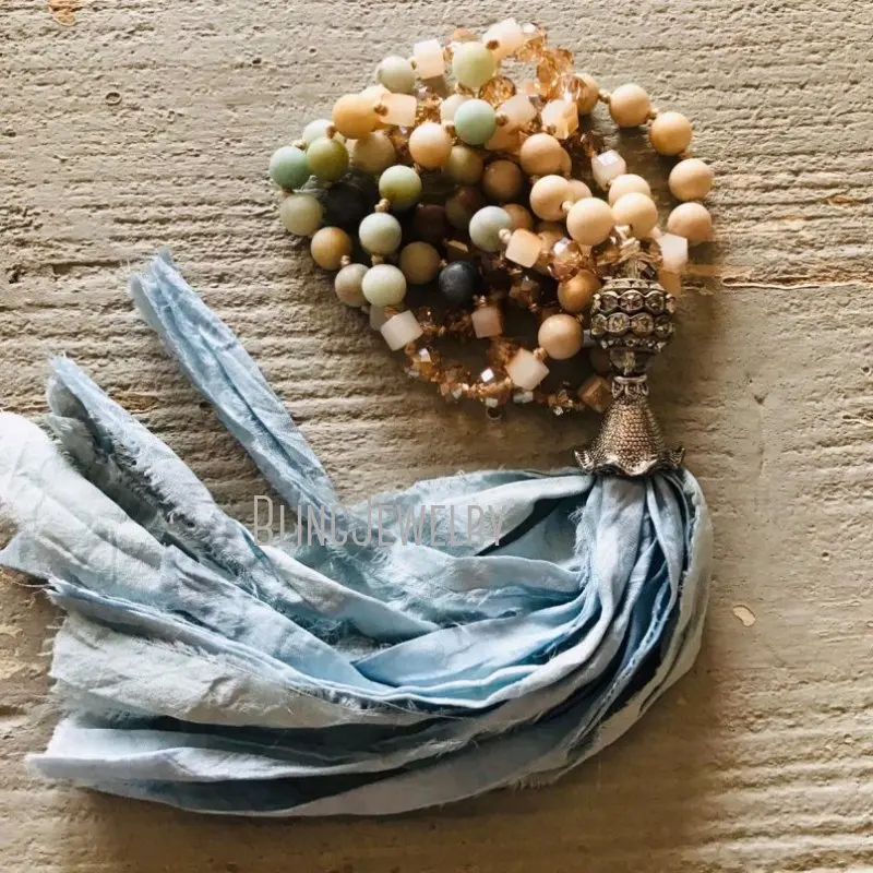 NM24966 Забавный аксессуар ожерелье с бусинами для женщин потертое Бохо голубое сари ожерелье с шелковой кисточкой Пастельное уникальное дизайнерское ювелирное изделие