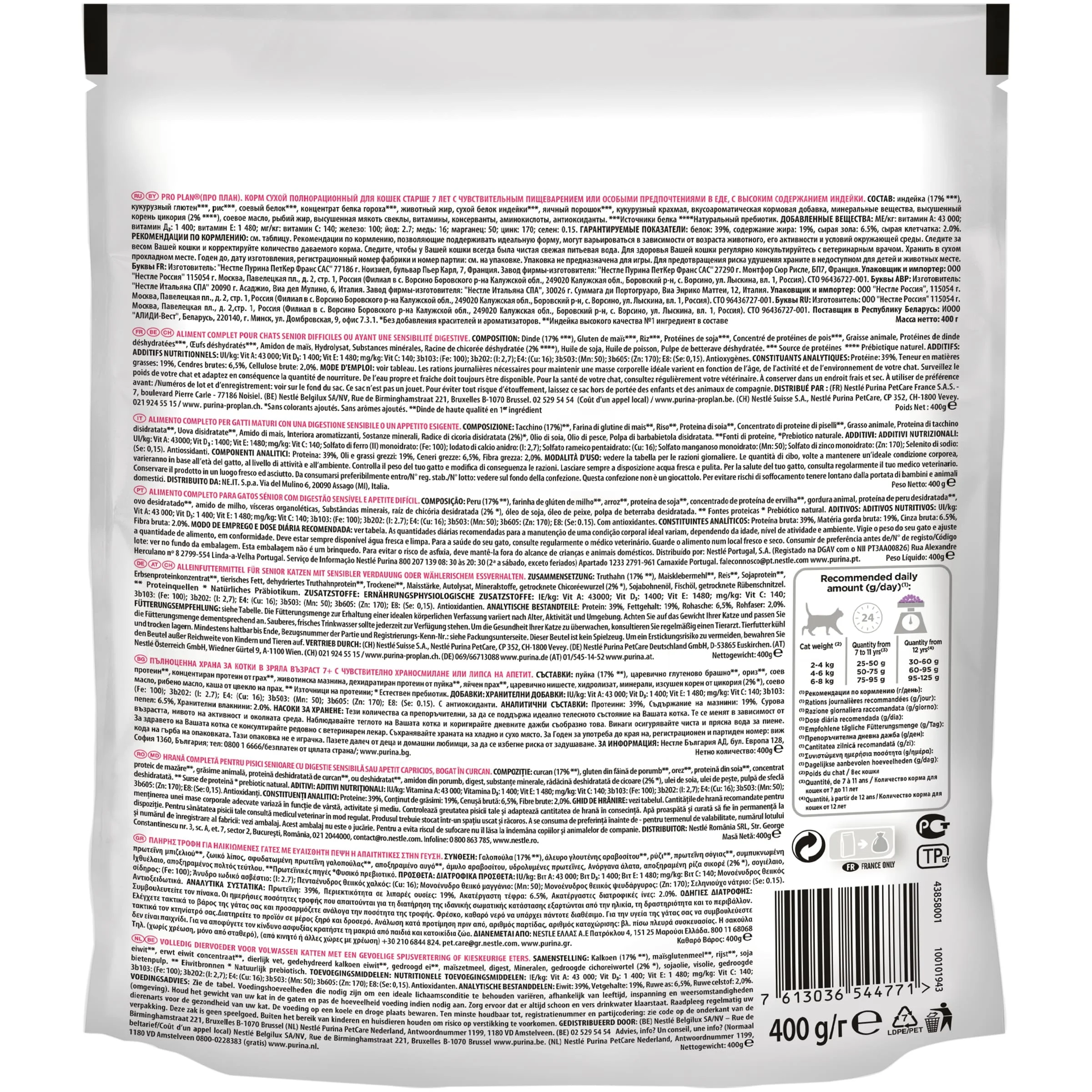 Сухой корм Pro Plan Delicate Senior для взрослых кошек старше 7 лет с чувствительным пищеварением, с индейкой, Пакет, 400 г Рекомендации по кормлению, позволяющие поддерживать идеальную форму, могут варьироваться в зависимости от возраста животного, его активности и условий окружающей среды. Следите за весом Вашей кошки и корректируйте количество даваемого корма. Следите, чтобы у Вашей кошки всегда была чистая свежая питьевая вода. Для здоровья Вашей кошки регулярно консультируйтесь с ветеринарным врачом. Состав: индейка (17%**), кукурузный глютен**, рис**, соевый белок**, концентрат белка гороха**, животный жир, сухой белок индейки**, яичный порошок**, кукурузный крахмал, вкусоароматическая кормовая добавка, минеральные вещества, высушенный корень цикория (2%*), соевое масло, рыбий жир, высушенная мякоть свеклы, витамины, консерванты, аминокислоты, антиоксиданты. **Источники белка *Натуральный пребиотик. Условия хранения: Хранить в сухом прохладном месте. Годен до, дату изготовления, регистрационный номер фабрики и номер партии: см. на упаковке.