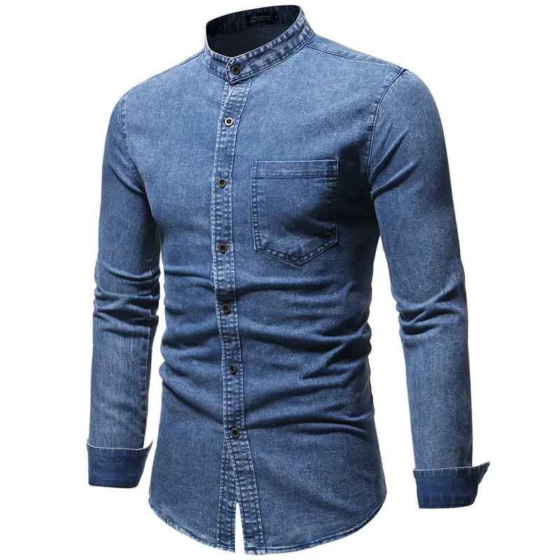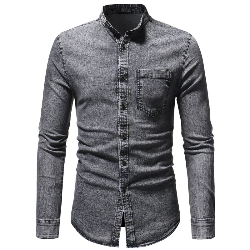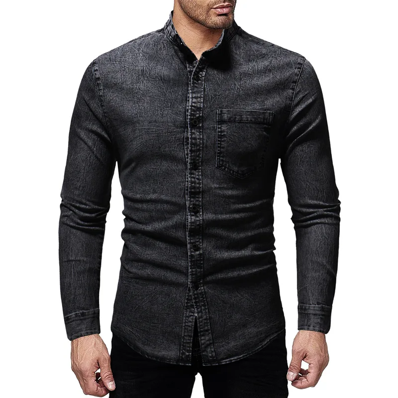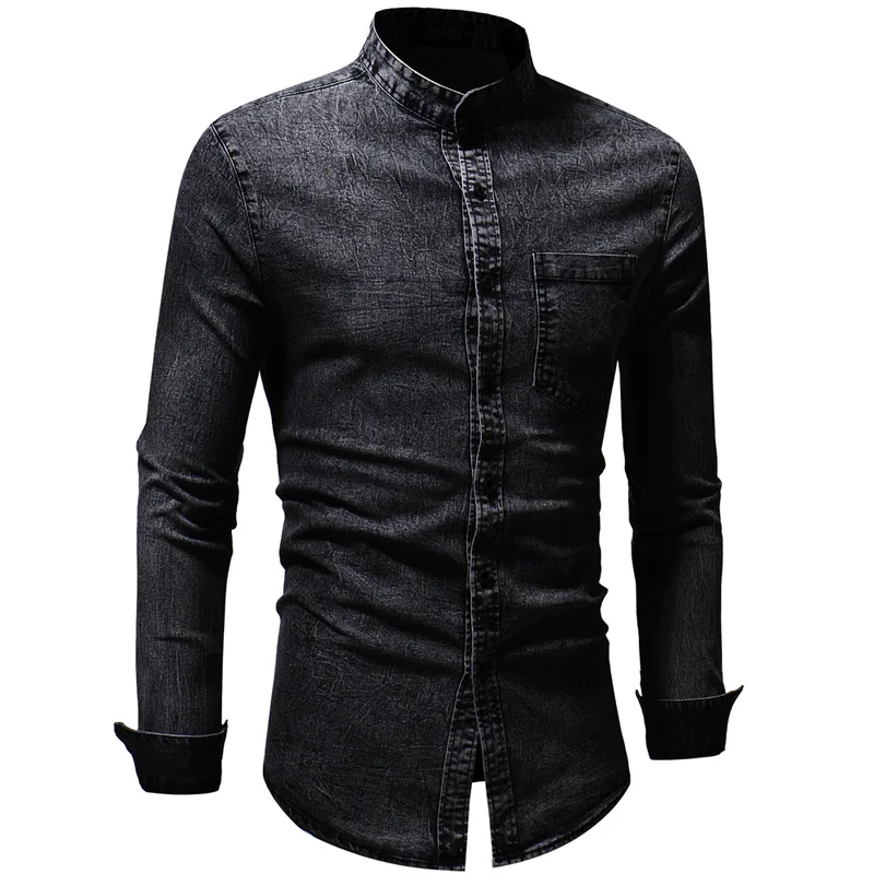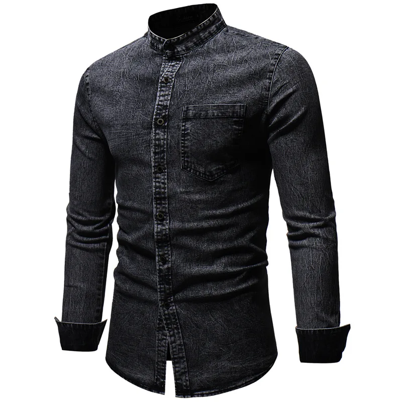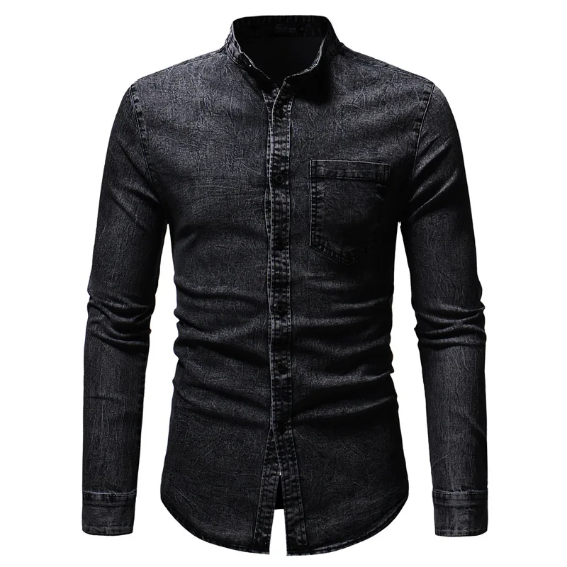 2019 Мужская рубашка приталенная однотонная с эффектом потертости размера плюс Мужская брендовая Повседневная Ретро одежда с длинным рукавом черная синяя джинсовая рубашка для мужчин