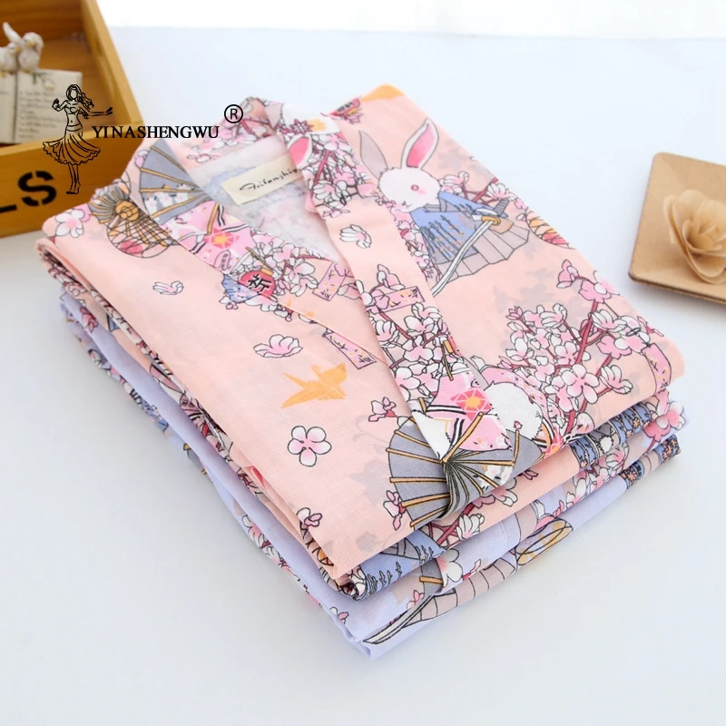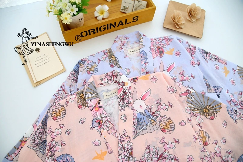 Японское кимоно юката, Женский Тонкий Свободный кардиган, пижамный комплект, лето, чистый хлопок, кролик и вишня, принт, домашний костюм для обслуживания
