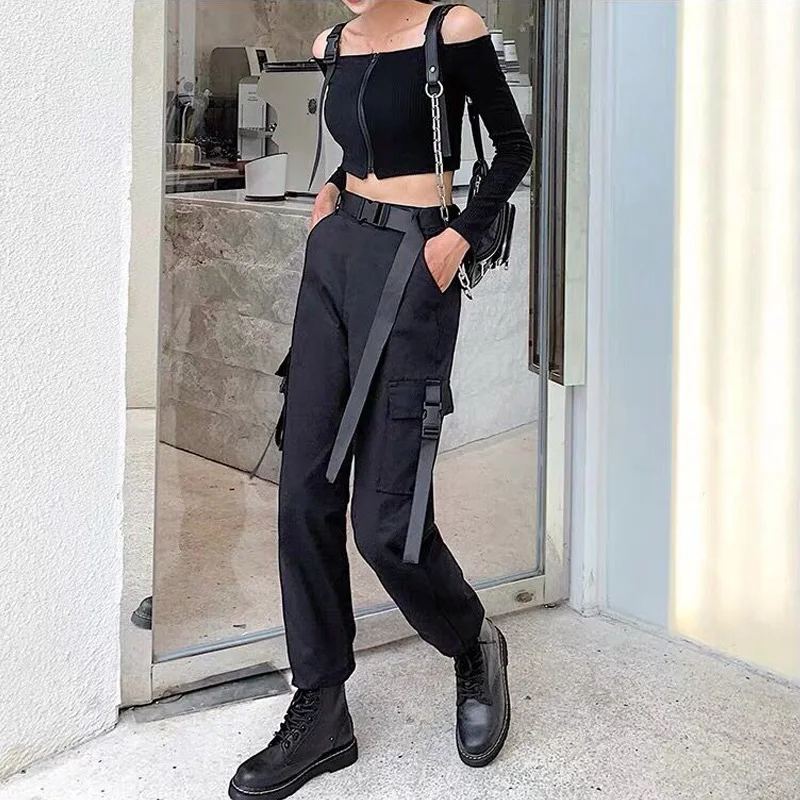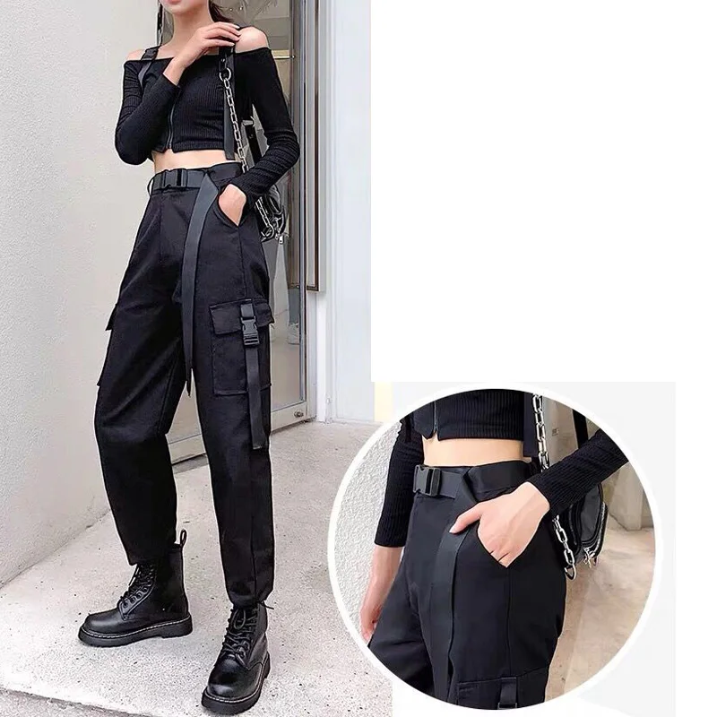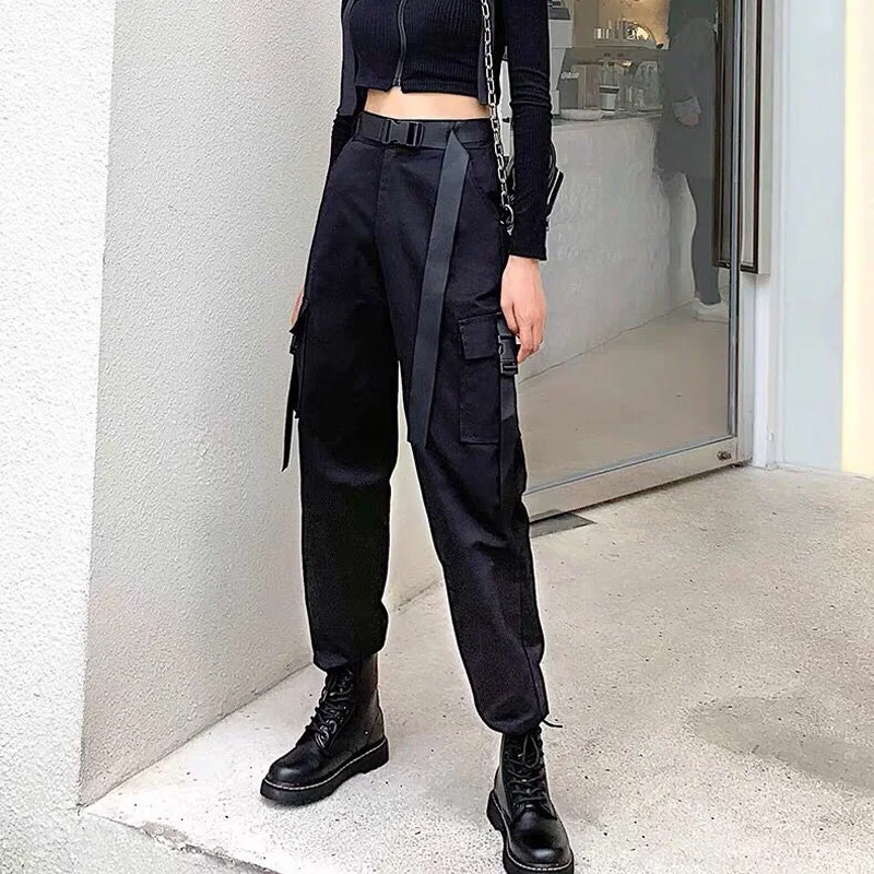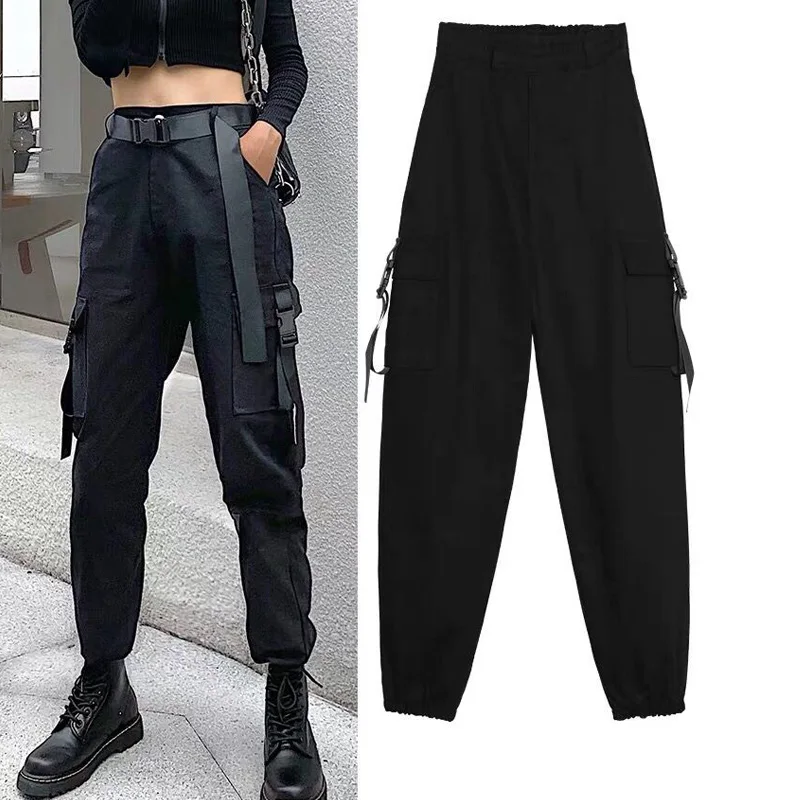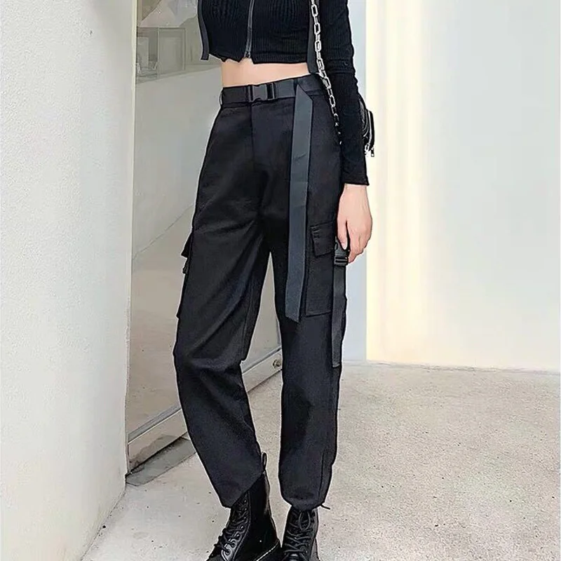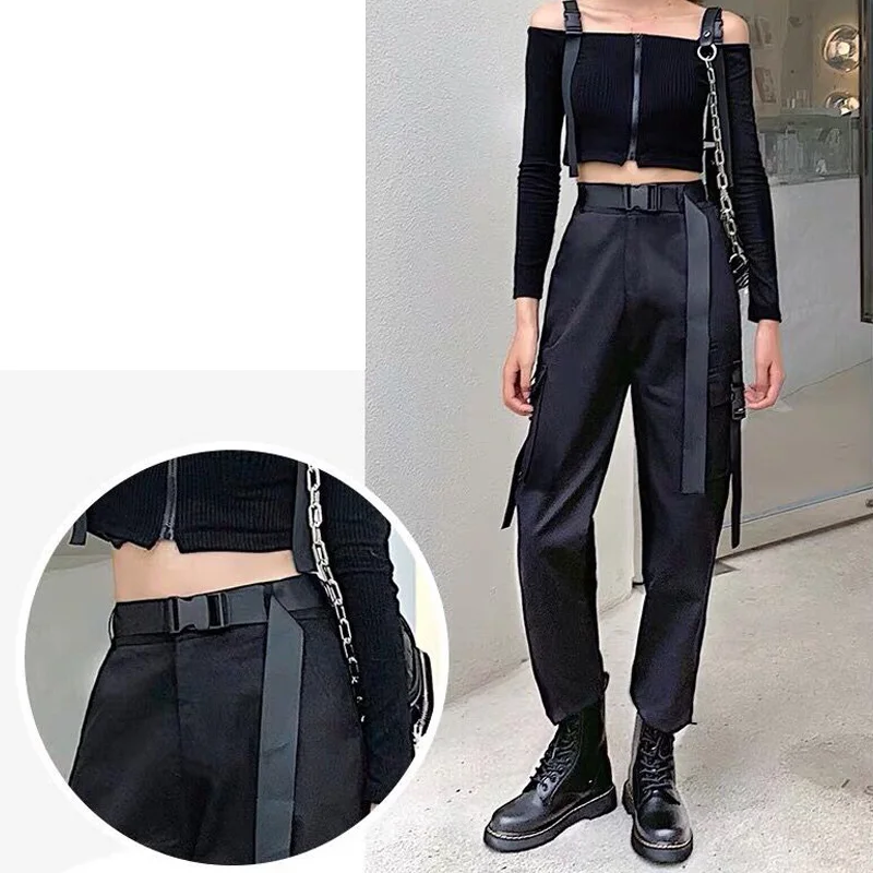 Женские брюки-карго Pantalones De Mujer, черные свободные штаны-шаровары в стиле панк, Харадзюку, Капри с поясом