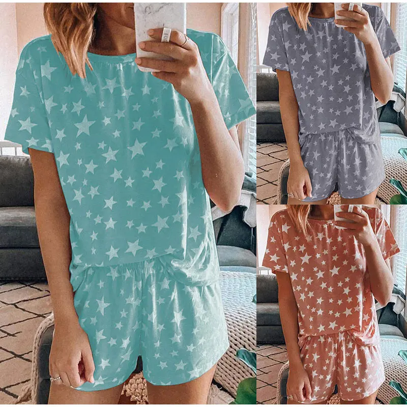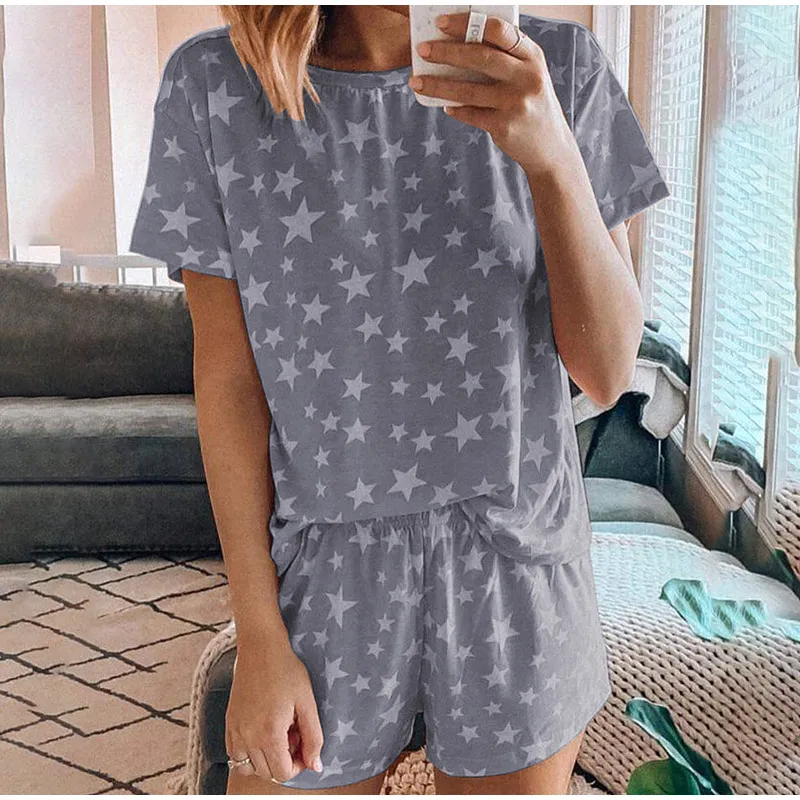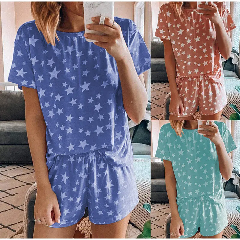 Летний пижамный комплект с круглым вырезом и коротким рукавом и шортами для женщин