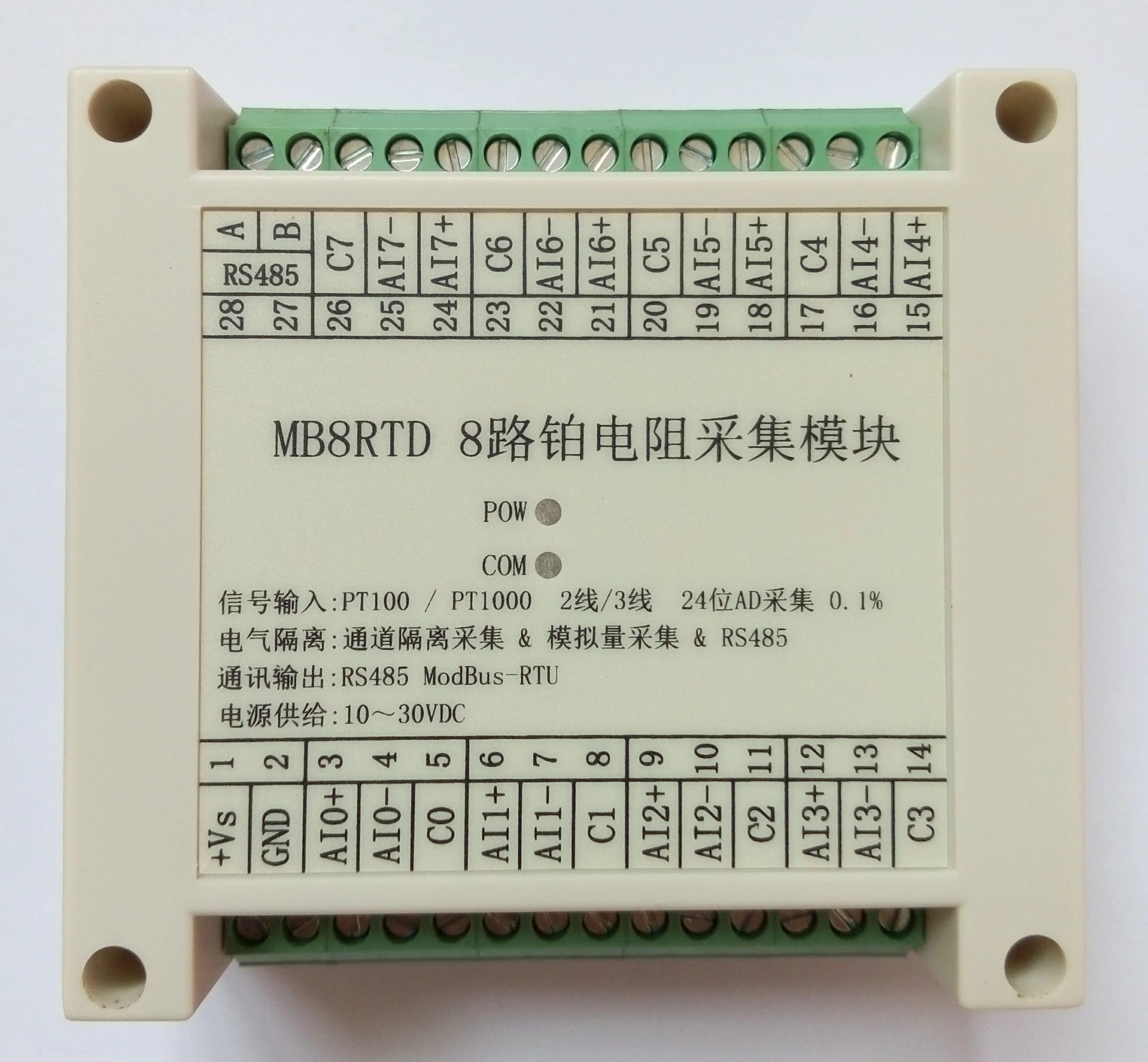 Моднявка = ckeditor Глава 1 Введение продукта Один. Обзор MB8RTD 8-канальный платинового Высокоточный модуль сбора, Платинового (PT100 / PT1000 @ 385 двойной возбуждения токи 500uA / 250uA соответственно) и другие сигналы; источник возбуждения с платиновым сопротивлением-двойной программируемый источник возбуждающего тока, точность и скорость приобретения выше и быстрее; Собранные аналоговые данные сигнала выводятся через изолированный интерфейс RS485; Модуль использует Modbus-RTU связь, которая может быть адаптирована к PLC, DCS и различным программным обеспечением конфигурации. Получение сигнала, ЦП и вход питания, а также RS485 коммуникационные электрические сигналы изолированы друг от друга, эффективно подавляя различные типы серийного режима и помех общего режима, обеспечивая точность данных, А также обеспечение надежной работы модуля. Две. Особенности 1. Принять стандартный протокол Modbus-RTU. 2. Вы можете установить Тип входного сигнала канала в соответствии с вашими потребностями. 3. Высокая точность приобретения сигнала: принимает высокой точности 24 бит AD и двойной возбуждения одинаковая программируемый источник постоянного тока. 4. Платиновое сопротивление принимает поглощение изоляции канала, чтобы эффективно предотвратить Перекрестие канала. 5. Безопасность: Получение сигнала, выход сигнала, источник питания, RS485 электрические сигналы связи изолированы друг от друга. 6. Защита связи: Интерфейс выхода сигнала связи RS485 принимает двойную защиту от перенапряжения и перегрузки по току. 7. Тип входного сигнала и формат связи могут быть установлены программным обеспечением. 8. Защита от полярности.