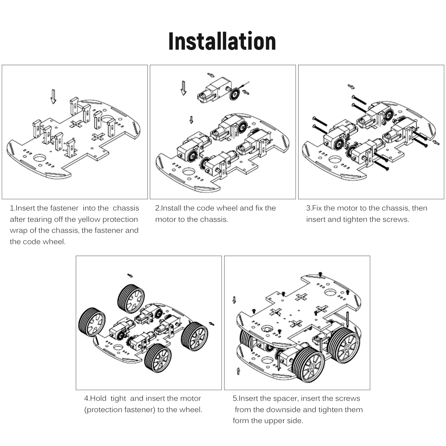 1.Insert the fastener into the chassis after tearing off the yellow protection wrap of the chassis, the fastener and the code wheel.