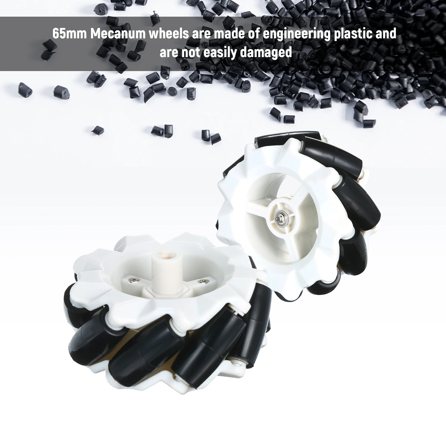 4 Mecanum Wheels: 4pcs 65mm Mecanum wheels can be moved in any direction without changing the direction of rotation of the wheels. They are made of sturdy engineering plastic and are not easily damaged.