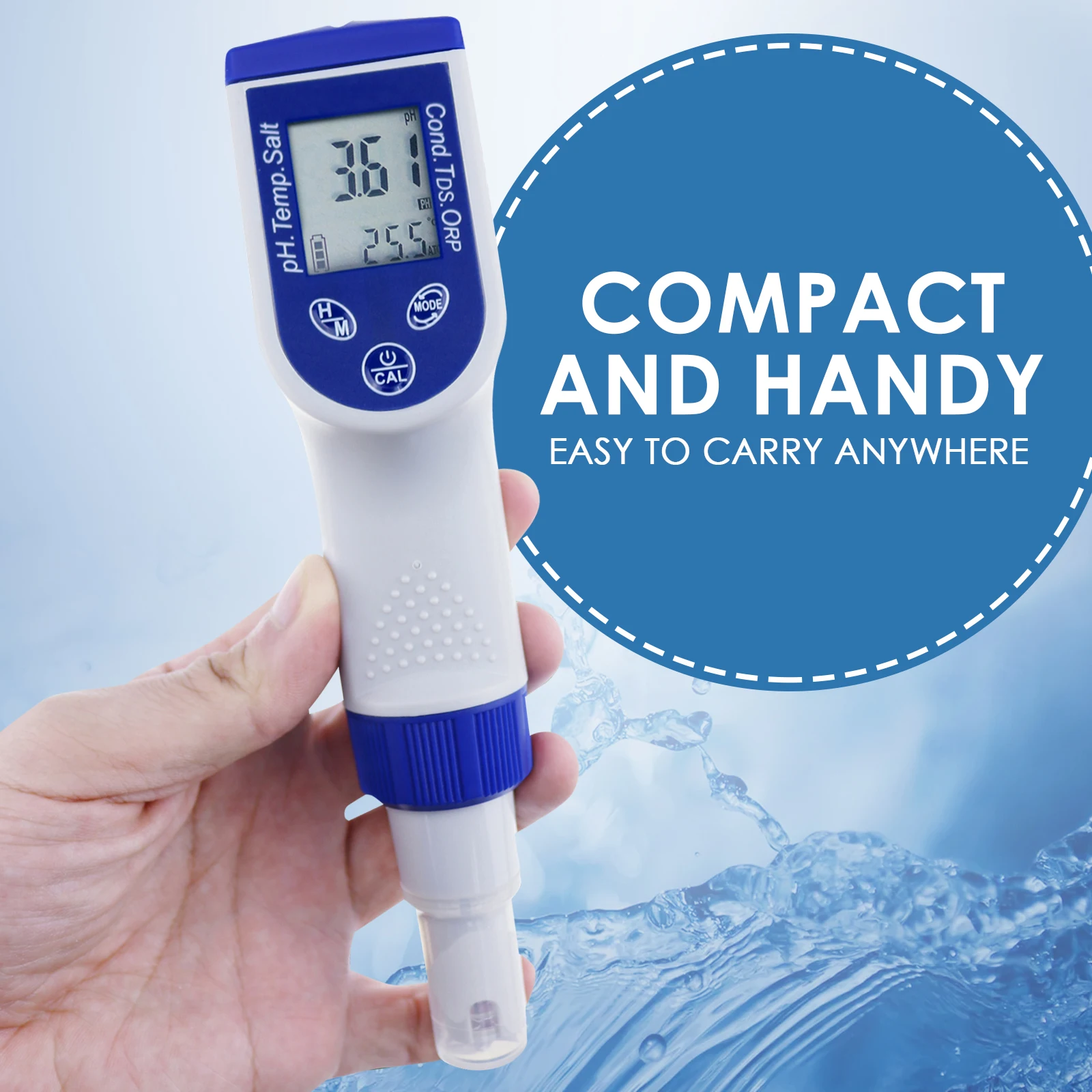This 6-in-1 Multi Parameter pentype water quality tester, can simultaneously measure pH, Conductivity, ORP ,Temperature (°C/°F), TDS and Salinity in one meter. It does not require a power supply to operate, so it can be used anytime and anywhere. Measured value is accurately shown in the large, easy to read and clear LCD.